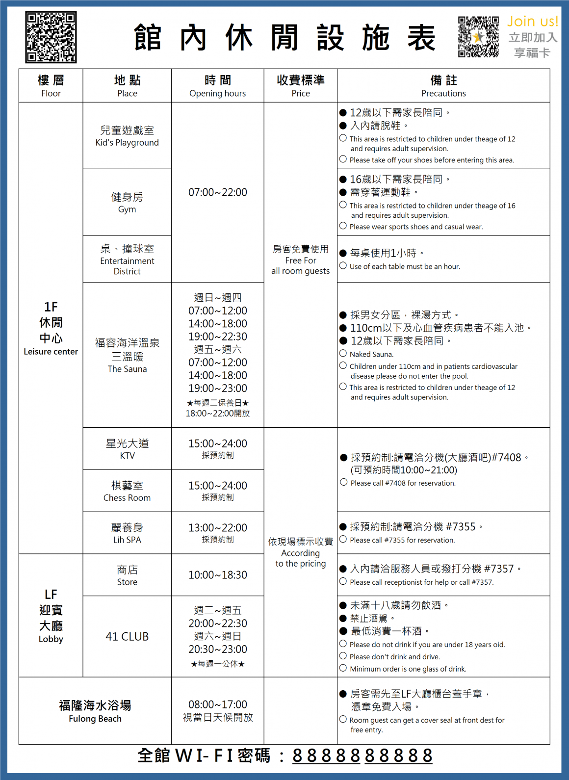 飯店房客至大廳櫃檯登記後均可免收費入場。