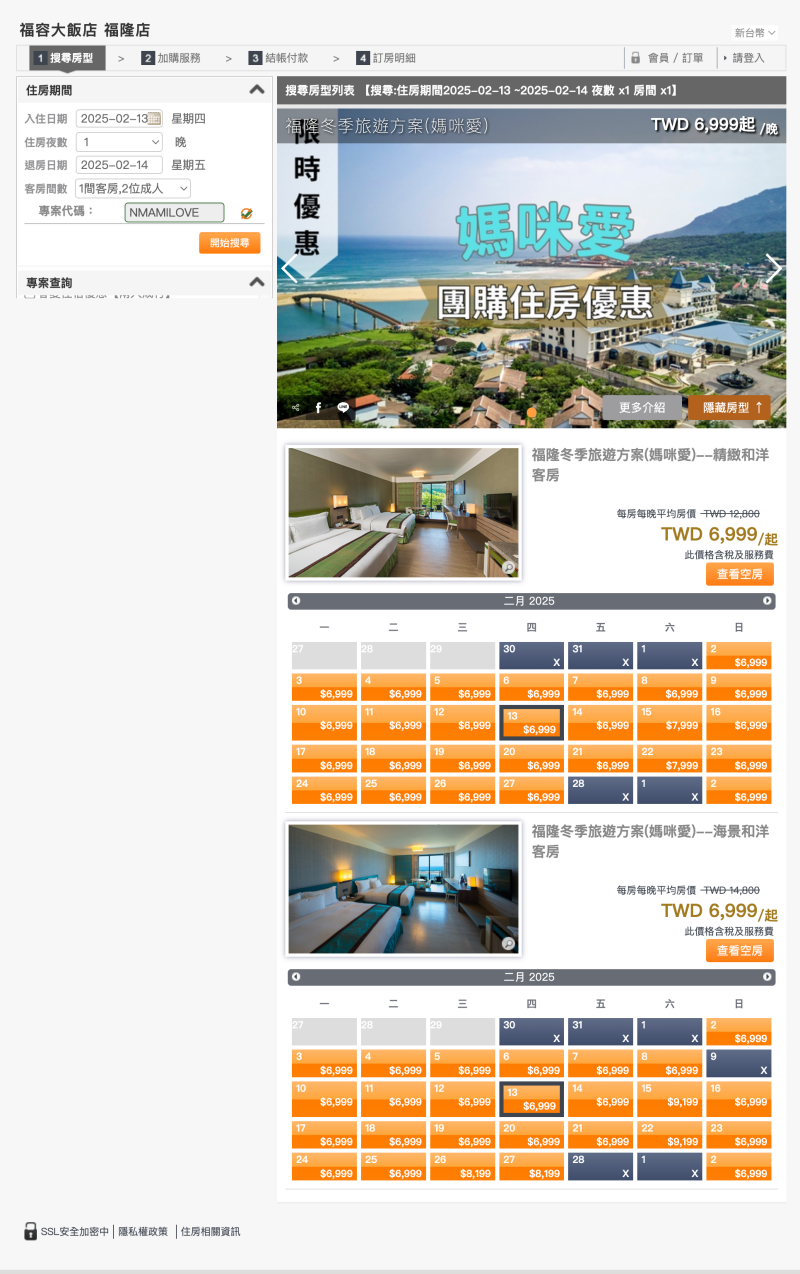 1. 點開訂房連結後,選擇輸入入住日期、人數、專案代碼後按開始搜尋,橘底為可訂日期、灰底則表示已無空房可訂囉!