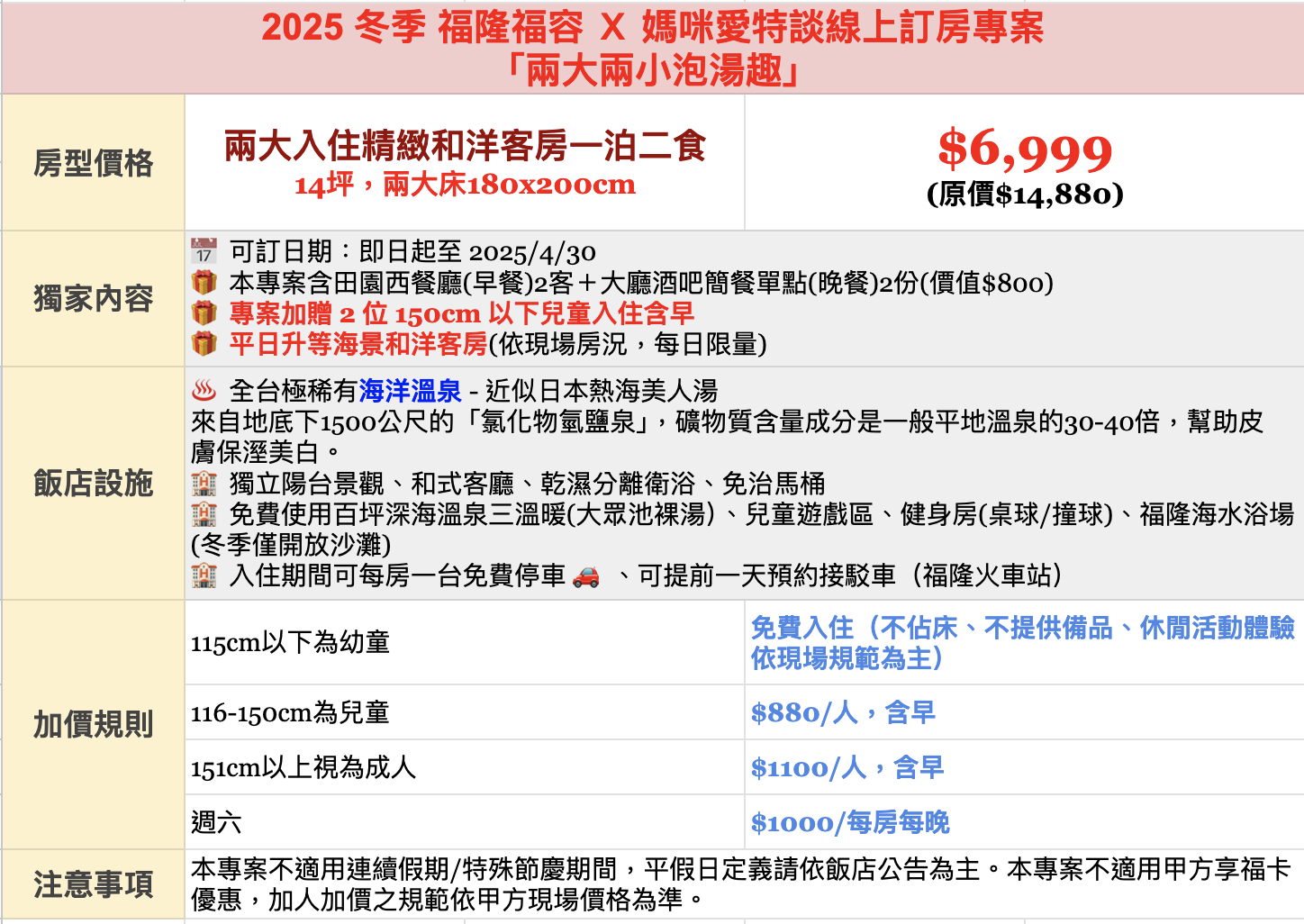 這次專案福隆福容大飯店兩大兩小泡湯趣,非常適合現在季節~讓爸比媽咪方便規劃親子小旅行,輕鬆享受海洋溫泉,體驗優質的親子行程,心動趁現在趕快下單囉!