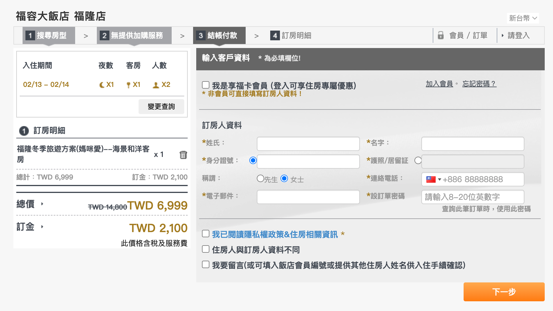 2. 選擇欲入住的日期後,填寫基本資料。填寫完畢後按「下一步」。並支付三成訂金作為保留訂房。
