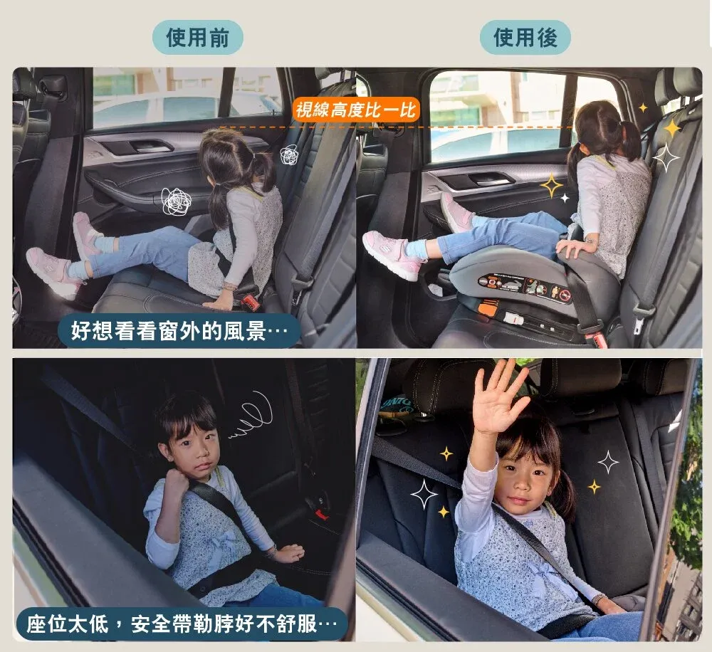 最後來看看安裝方式吧!因爲有ISO-FIX的功能,所以除了一般增高墊直接放上去以外,如果車子有支援ISO-FIX那還能讓座椅固定的更牢靠,讓小朋友能坐在增高墊上胡搞瞎搞動來動去,展現出他們的活力!