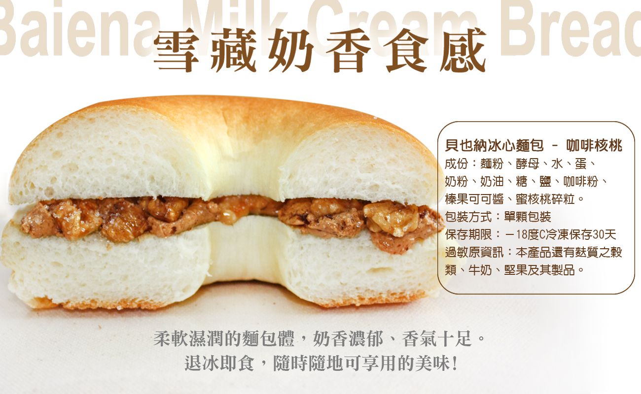 貝也納(維也納)冰心麵包~在嘴裡融化的奶油加上糖粒,外皮是經典柔軟濕潤的麵包,雙重甜蜜滋味香氣十足~而且這款冰心麵包是退冰就可以吃的喔!無需烘烤直接吃好過癮!