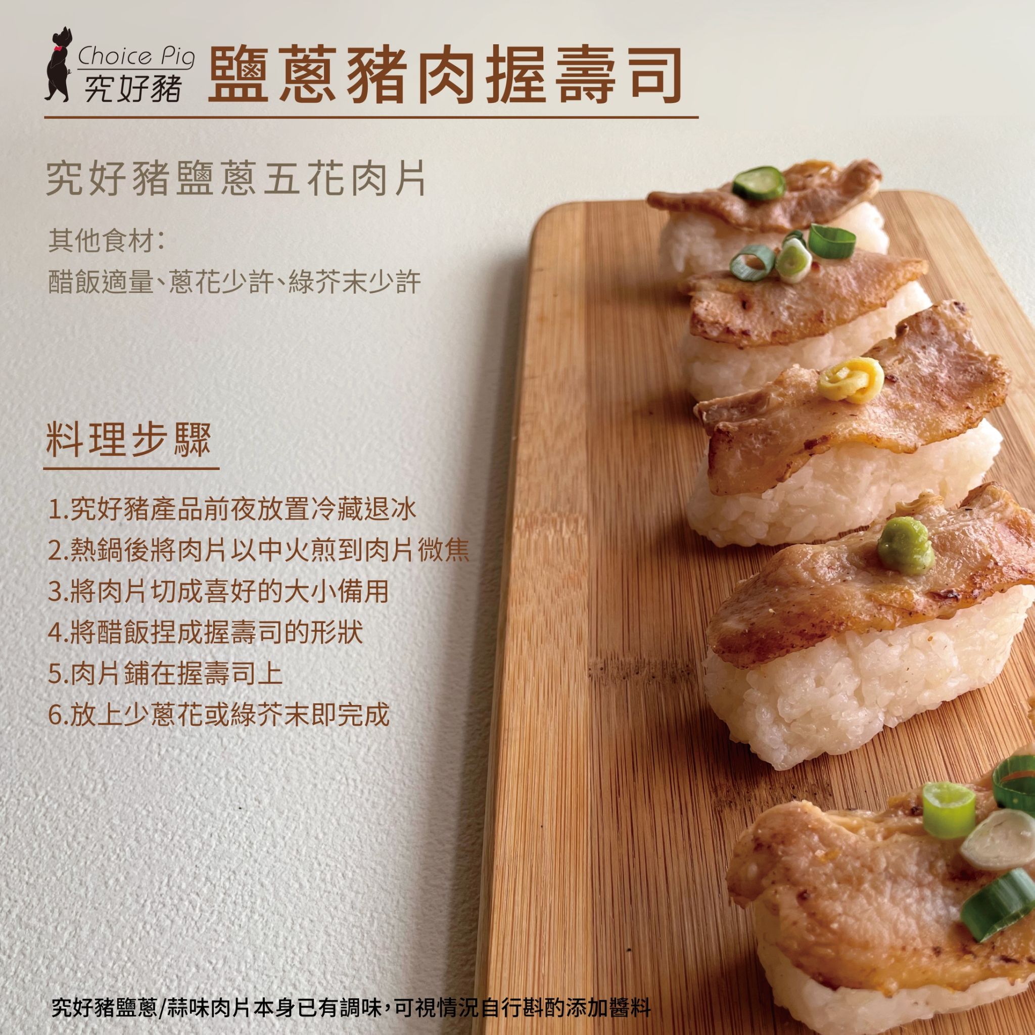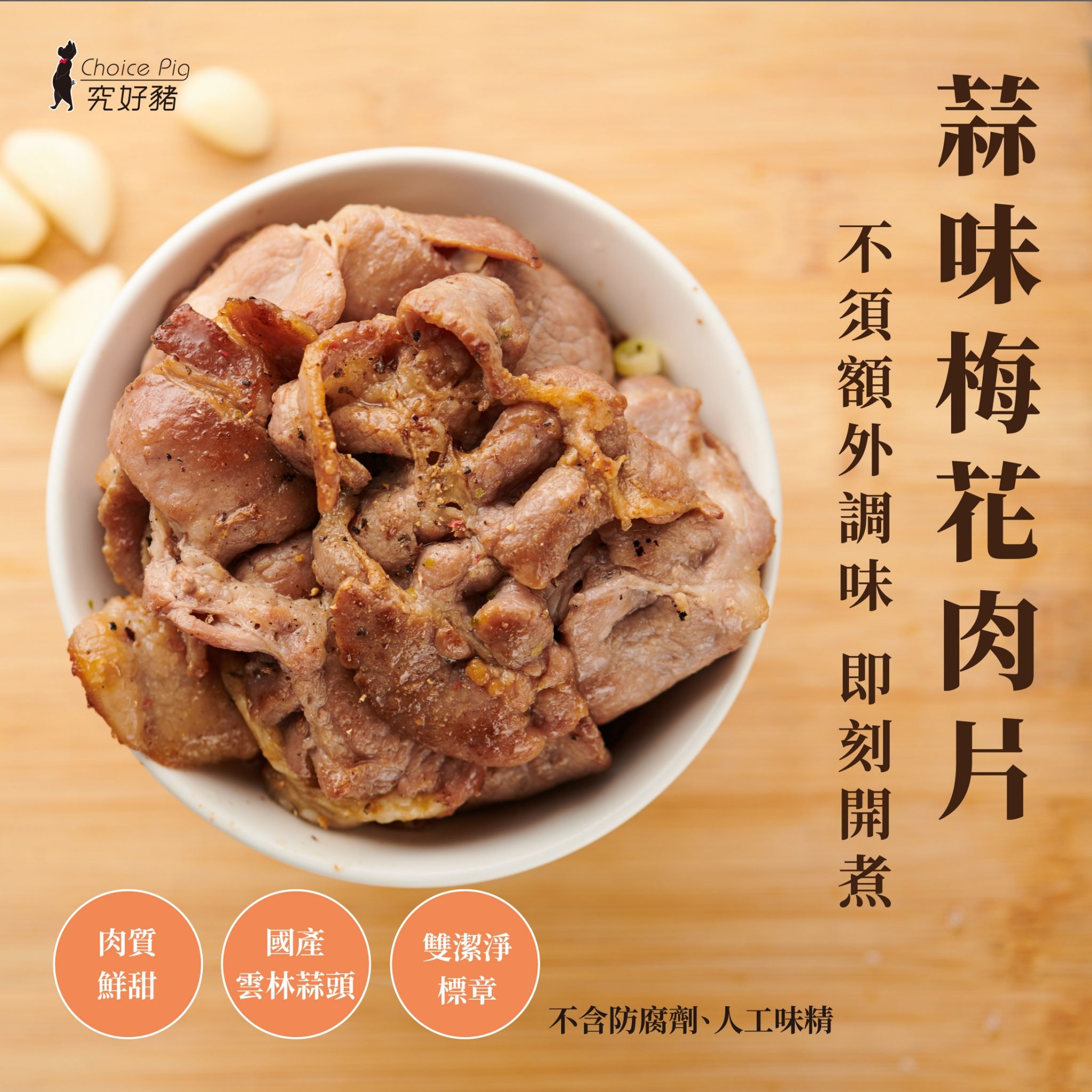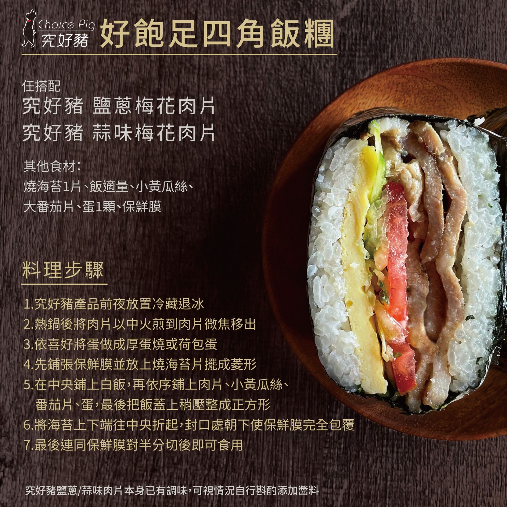 內容物:鹽蔥梅花肉片260g/包、鹽蔥五花肉片260g/包、蒜味梅花肉片260g/包、蒜味五花肉片260g/包+纖享豬排180g/包