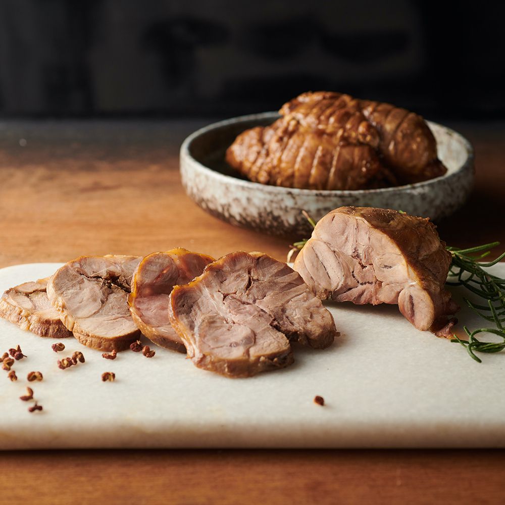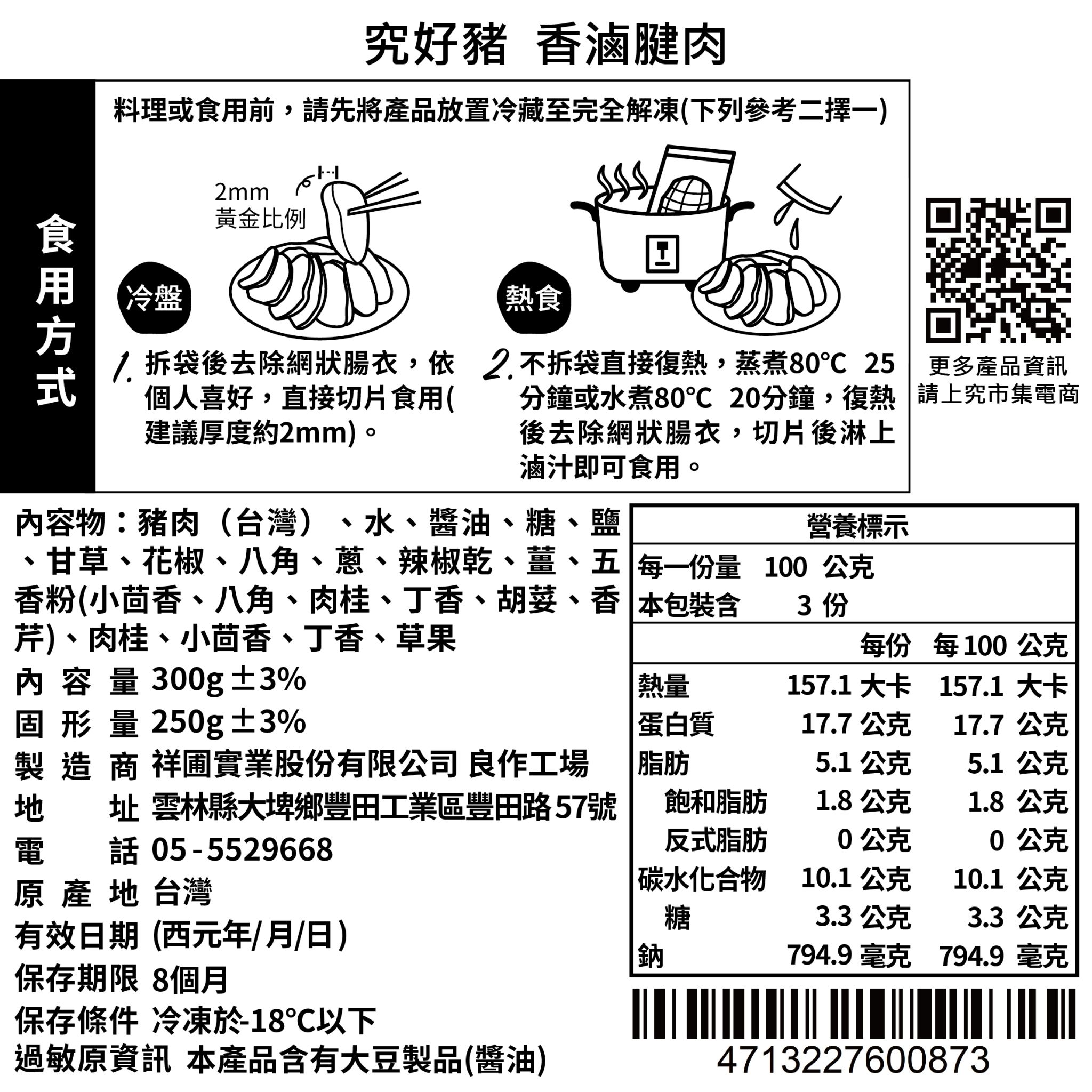 精選究好豬後腿腱肉,油脂少又帶點筋,口感軟中帶Q有嚼勁。只要解凍至冷藏狀態,依個人喜好切片冷盤或覆熱即可食用。