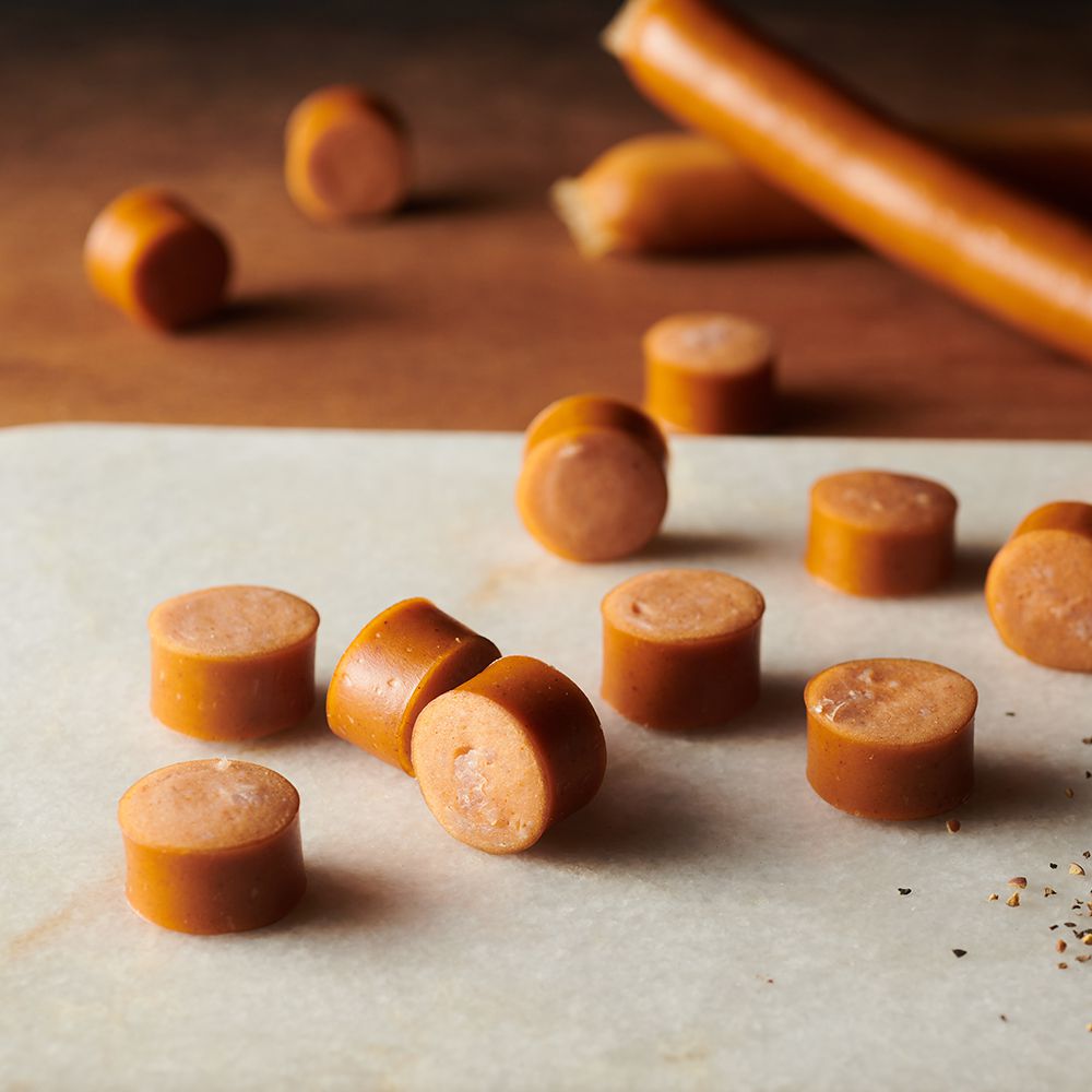 這款香腸以肉丁取代絞肉,加入黃金比例的豬背脂丁,搭配天然豬腸衣,其中的調味也是讓人耳目一新的,編媽覺得他的香料味調配得非常好,可以吃到香料的香氣,卻又不會搶了豬肉甘甜的風采,搭配得相得益彰超級下飯!