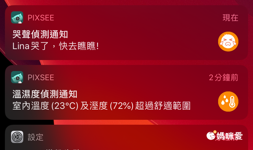 使用寶寶攝影機的重要目的,就在於當爸爸媽媽沒辦法陪在寶寶身邊時~寶寶攝影機能協助監控寶貝~~~其中小佩媽最擔心的一點就是寶寶哭了但沒聽見,這時pixsee會發出訊息通知!