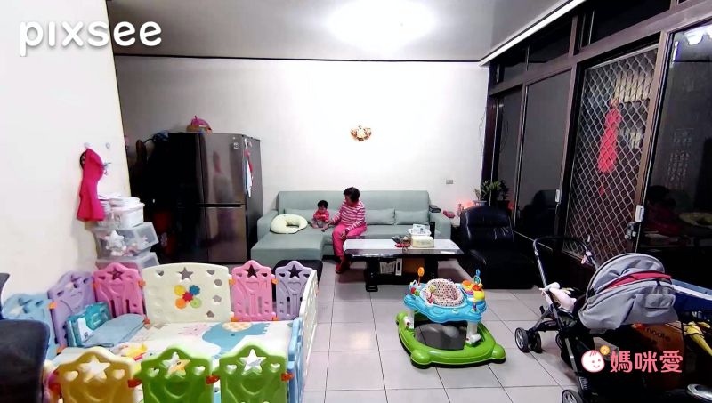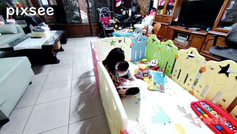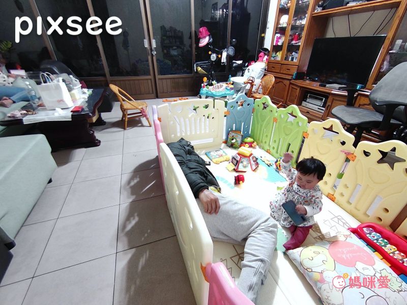 小佩媽咪上班前,會將pixsee AI 寶寶攝影機移放在客廳電視櫃平台上!因平常媽媽都是一個人在家,除了可以觀察Lina寶寶的狀況外,還可以照顧到小Lina的奶奶啦~pixsee的超廣角,不用一直調整攝影方向,直接一目瞭然!