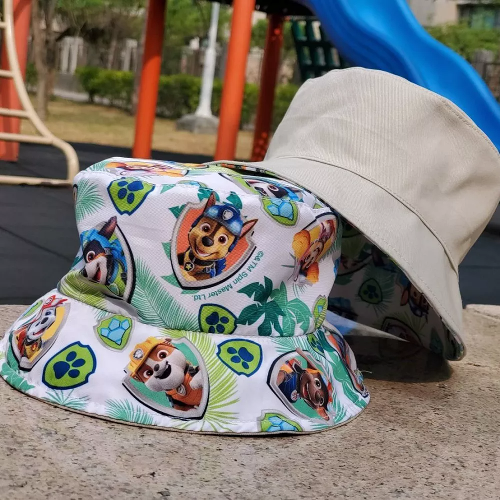 台灣製造的雙面遮陽帽,有素色卡其色跟繽紛的汪汪隊兩種圖面,可以隨時依照孩子需求翻面使用,表面還有防潑水處理喔!