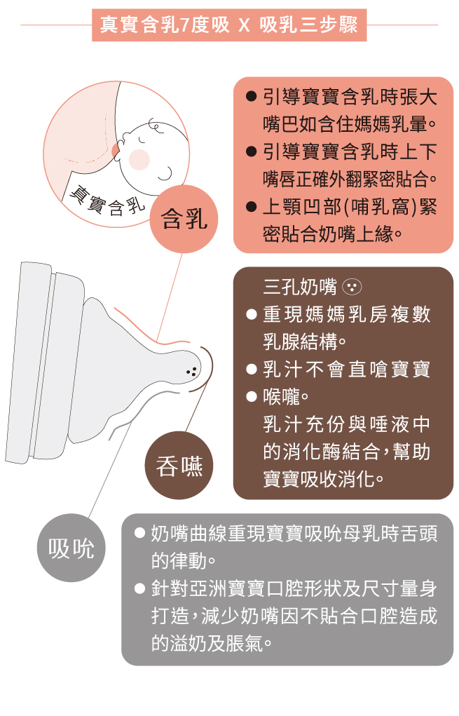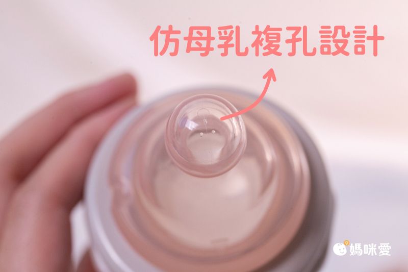 母乳複孔設計,則是重現媽咪乳房的複數乳腺結構,乳汁不會嗆到寶寶,又能與唾液中的消化酶結合,幫助寶寶吸收消化。