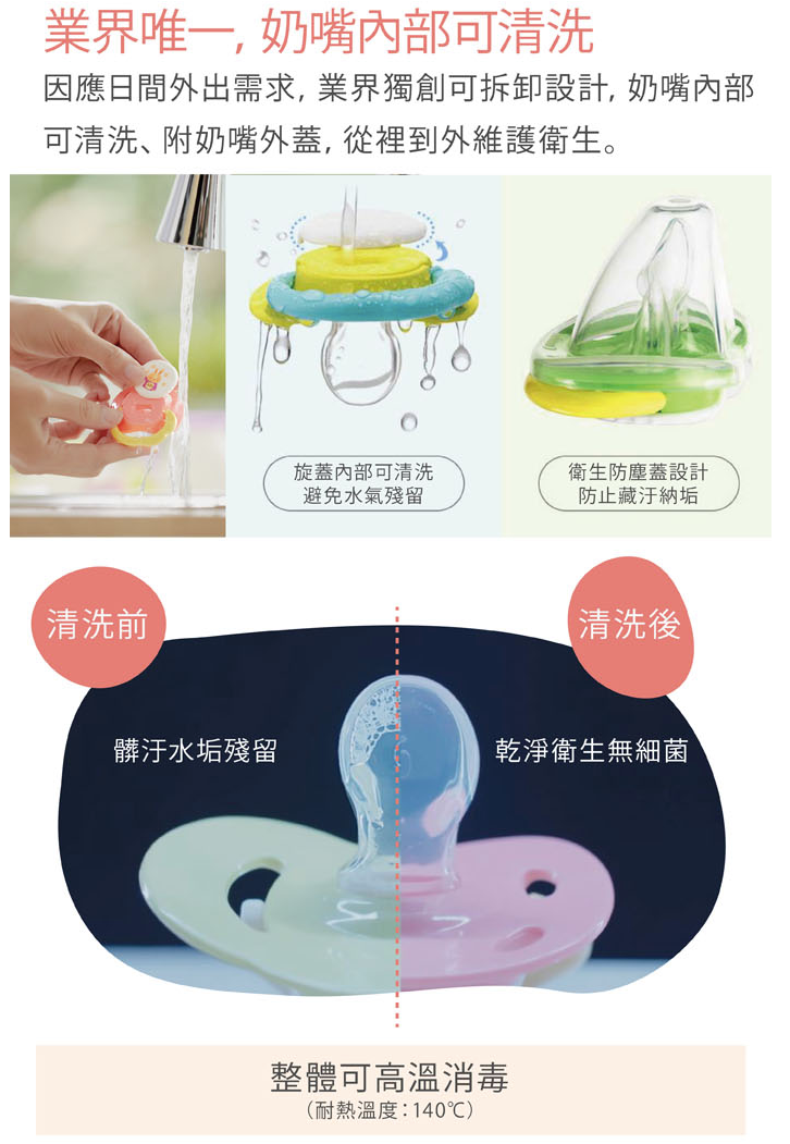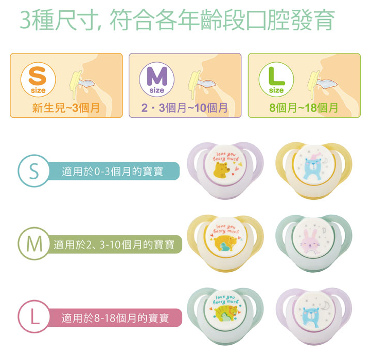首創日夜雙模式安撫奶嘴,符合寶寶白天及夜間各種狀況的安撫需求~日本小兒齒科醫生監製,考量寶寶的齒顎設計,寶寶齒列發展不擔心!3D立體貼合寶寶嘴形,不易從嘴巴掉出,減少空氣吸入,防止脹氣發生!任選兩件再打九折!