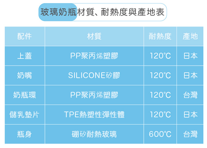 產地:上蓋、中環、奶嘴、儲乳墊片 日本製;瓶身 台灣製