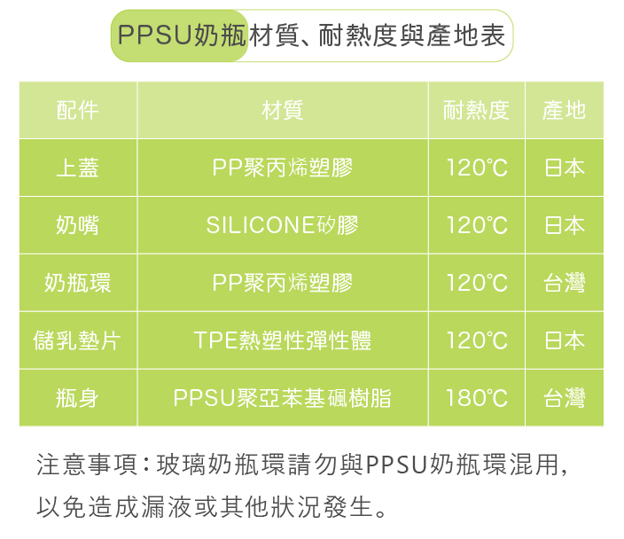 玻璃奶瓶環請勿與PPSU奶瓶環混用,以面造成漏液或其他狀況發生。