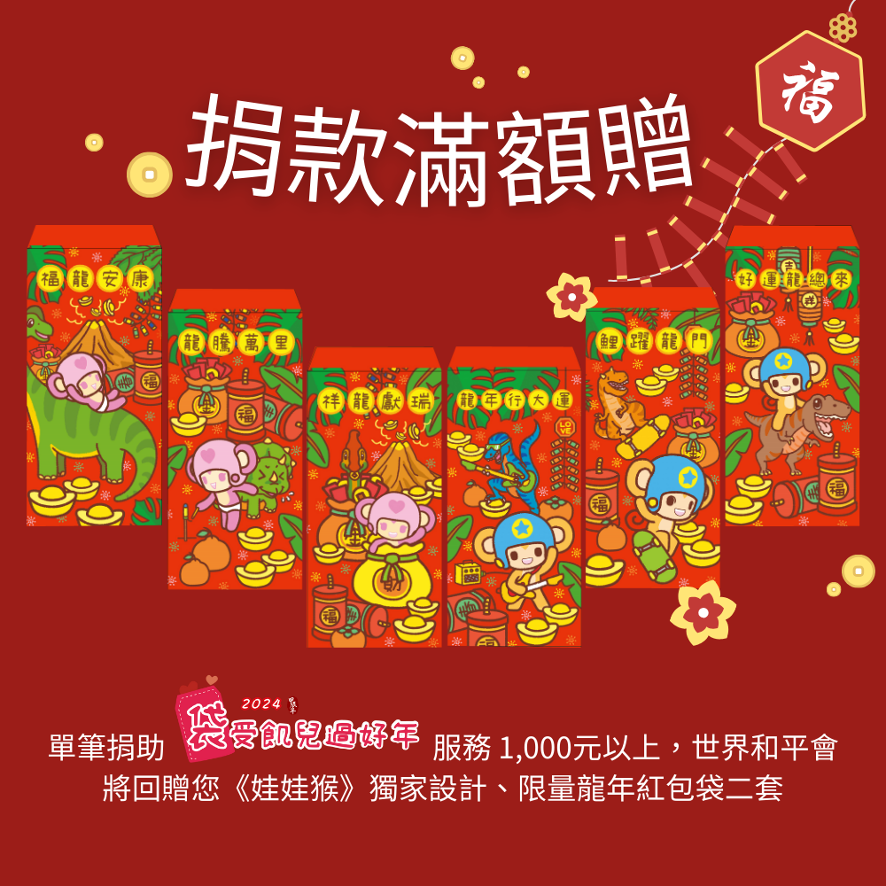 單筆捐助「『袋』受飢兒過好年」服務 1,000元以上,世界和平會將回贈您《娃娃猴WOW MONKEYS》獨家設計 ‧ 限量紅包袋二套(一套六款龍年紅包袋),願大家的福氣隨著新年「龍」總來。
