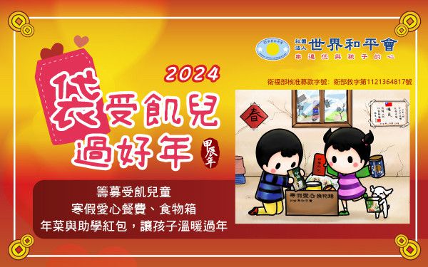 對許多受飢兒童來說,寒假與農曆新年並不那麼快樂,反而令人擔憂!學校放寒假,也代表餓肚子的時刻來臨了,孩子總擔心不知道何時可以吃到下一餐?2024年初,世界和平會號召大家一起關懷受飢兒童,希望協助家境辛苦的孩子們能有寒假餐費、寒假愛心食物箱、愛心年菜與傳愛紅包,有溫飽、安穩的新年,充滿希望地迎接每一天的好日子!