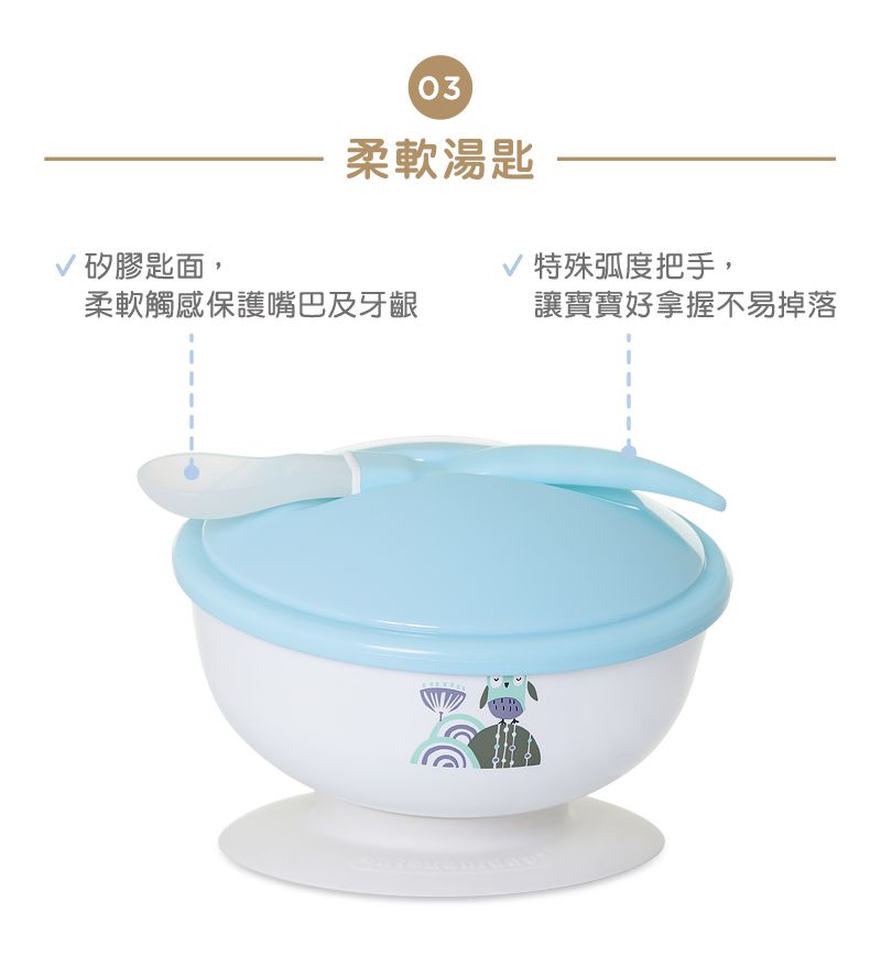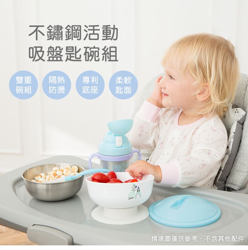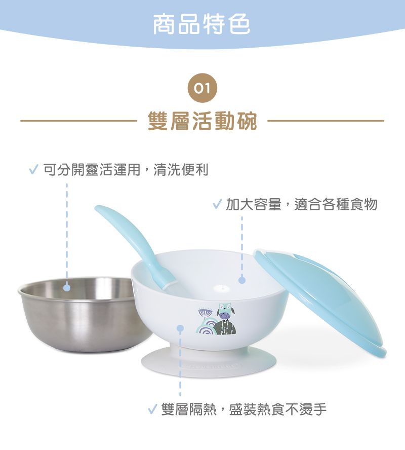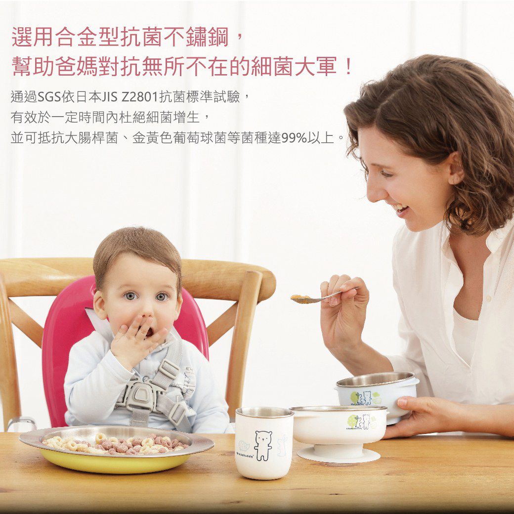材質: 碗杯盤內襯/湯匙:ASTM 304抗菌不鏽鋼 碗杯盤外襯:PP聚丙烯(耐溫-20℃~100℃) 碗杯上蓋:PE聚乙烯(耐溫-20℃~80℃) 專利防滑底座:Silicone矽膠(耐溫-20℃~100℃)