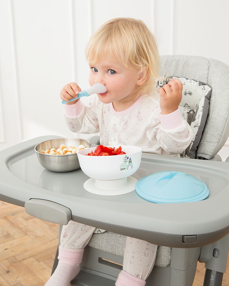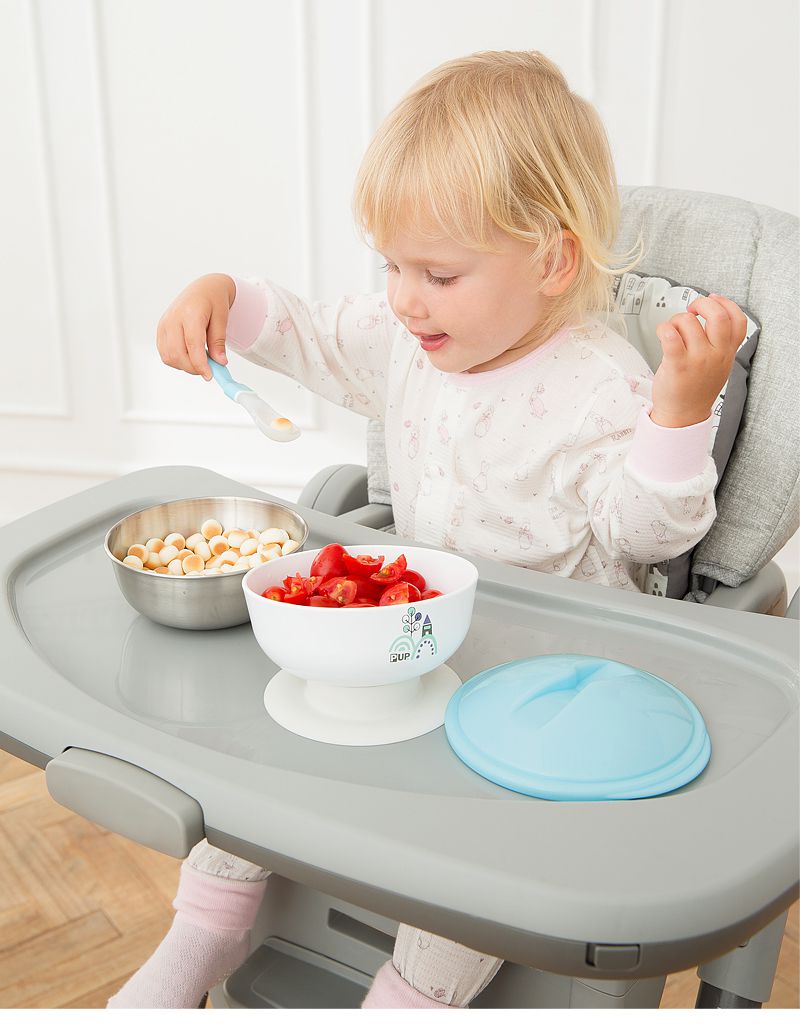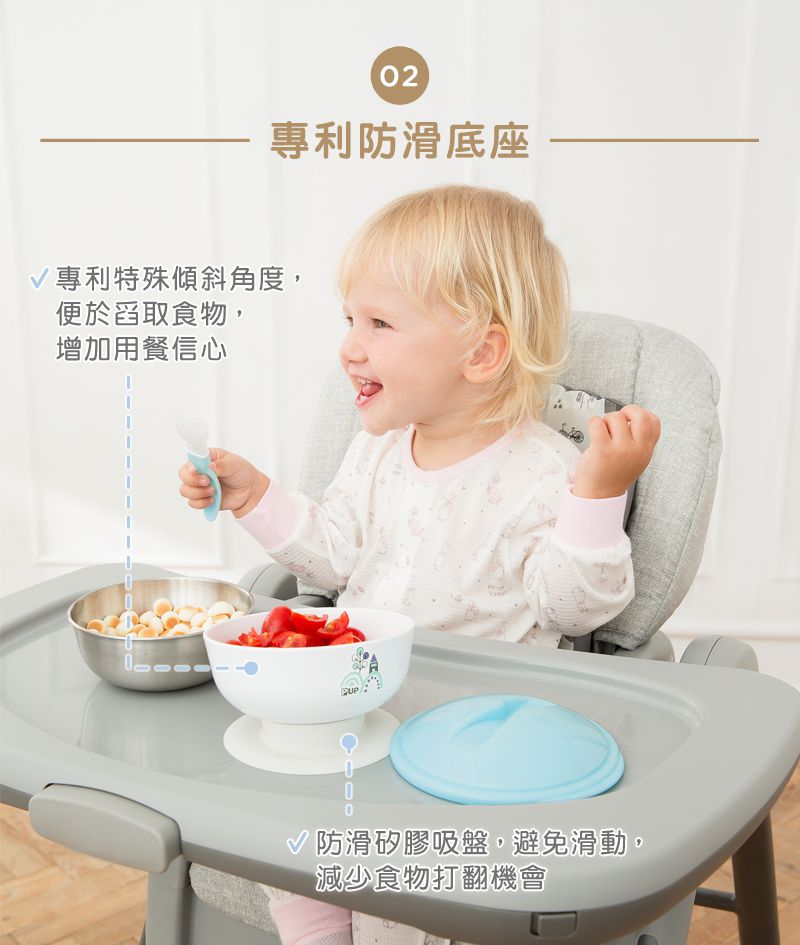 餐碗的防滑底座設計,加上傾斜角度設計,提高寶寶學習用餐信心