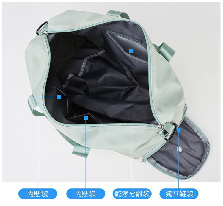 大容量空間,多功能夾層分隔設計,不論大小東西都有自己的位置,找東西不再慌慌張張;還有乾濕分離夾層,可攜帶多樣物品又照樣輕便!
