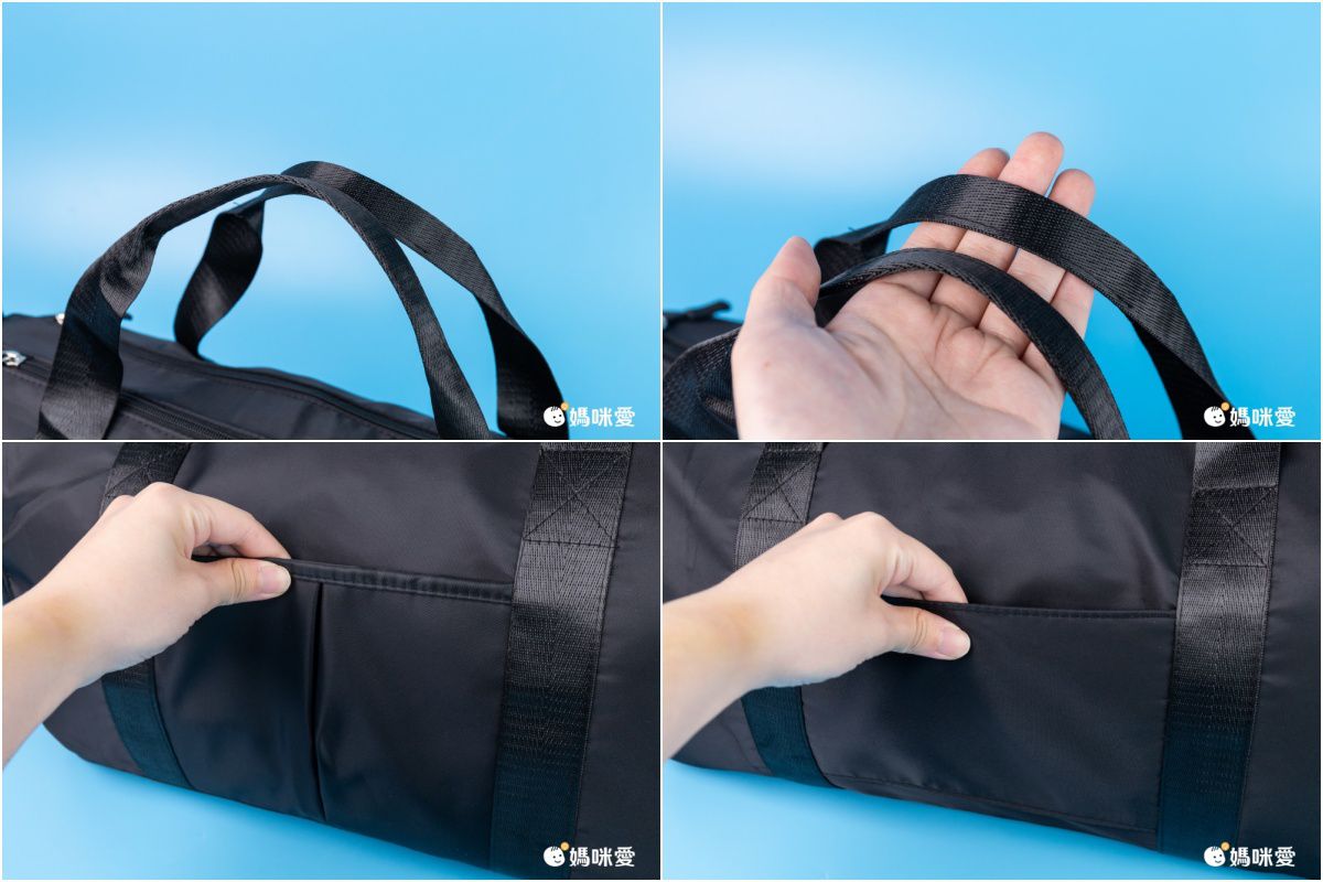 手提把耐重不刮手的設計,提起來也不會勒手;側邊還有插袋方便裝臨時會需要拿到的物品,比如通勤的票券、衛生紙、濕紙巾等小物;另一面側邊則是行李插袋