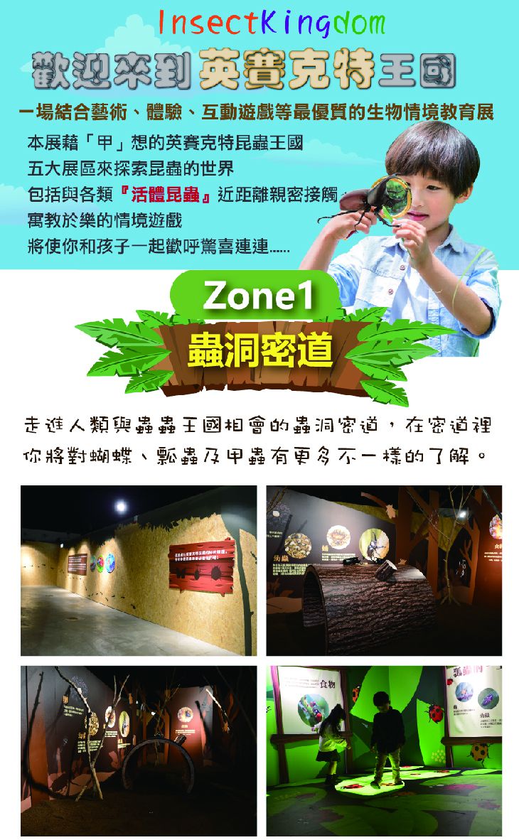 歡迎來到英賽克特王國(InsectKingdom),一場結合藝術、體驗、互動遊戲等最優質的生物情境教育展!本展藉「甲」想的英賽克特王國,五大城區來探索昆蟲世界!