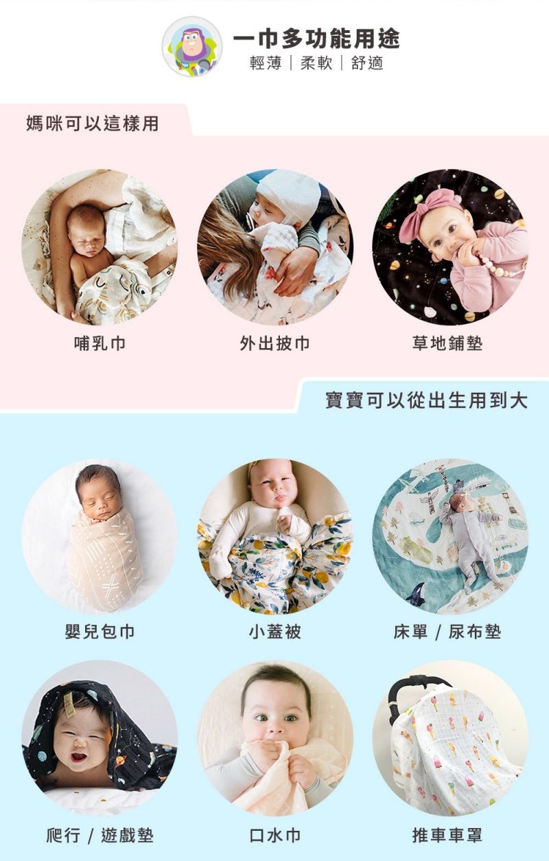 除了當作包巾使用之外,也有很多其他用途,寶寶一路用到4、5歲都不是問題!例如麥麥媽咪也很喜歡拿來當作小床單,120*120的大尺寸,還可以反摺蓋住beego的小肚肚