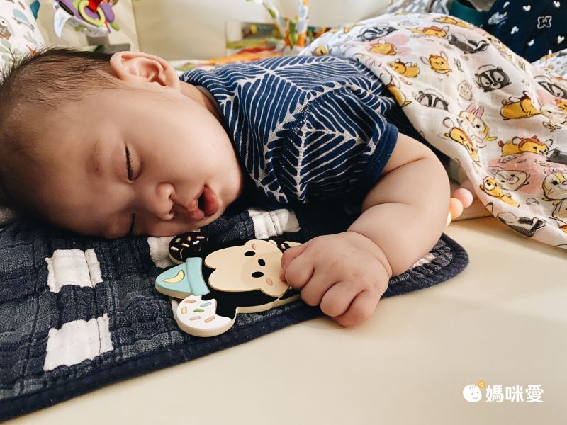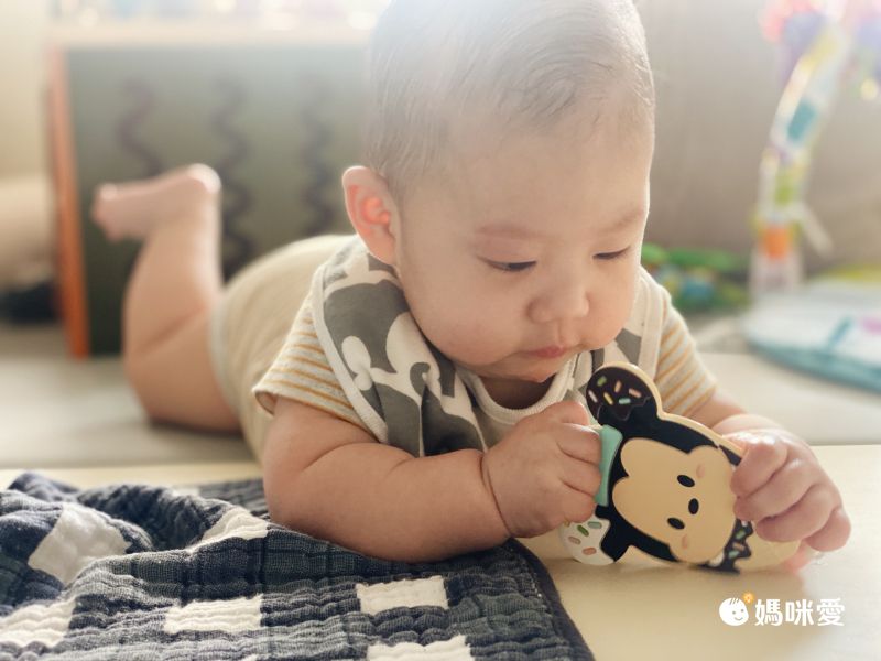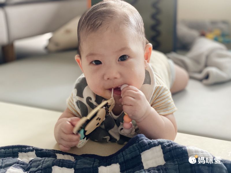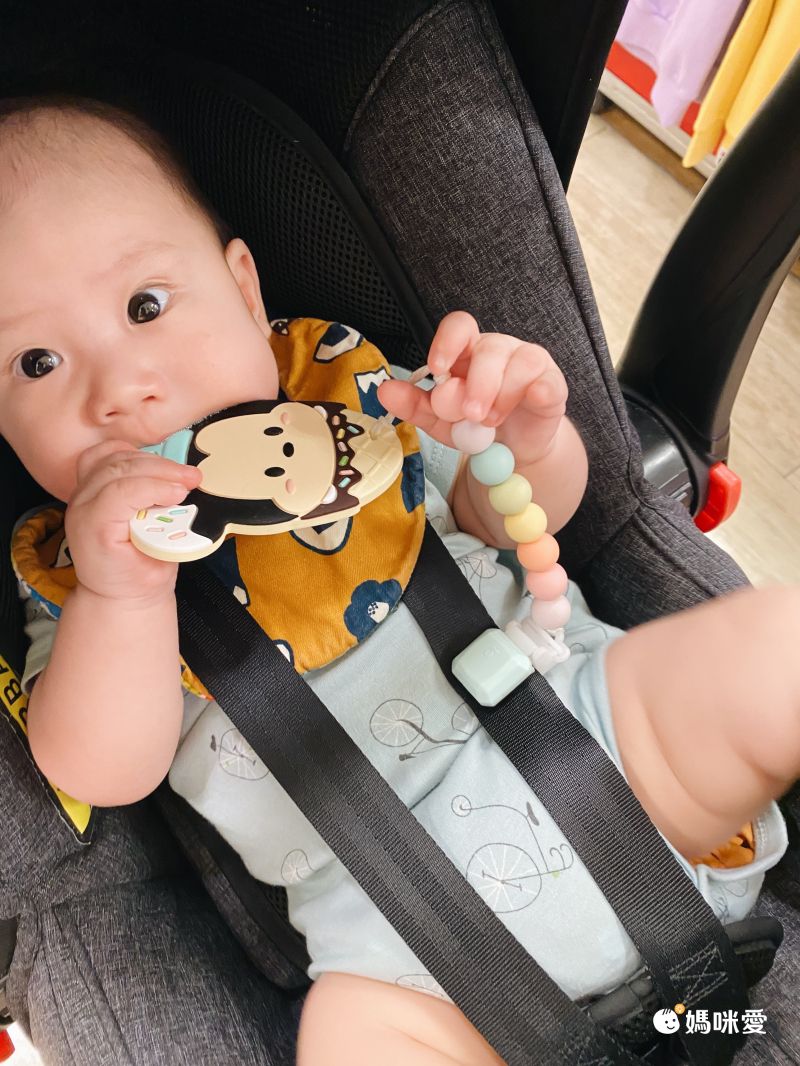 100%食用級矽膠成分,不含BPA、塑化劑,讓5個月大的Wumai弟弟能盡情的咬咬咬,舒緩長牙時的不適感