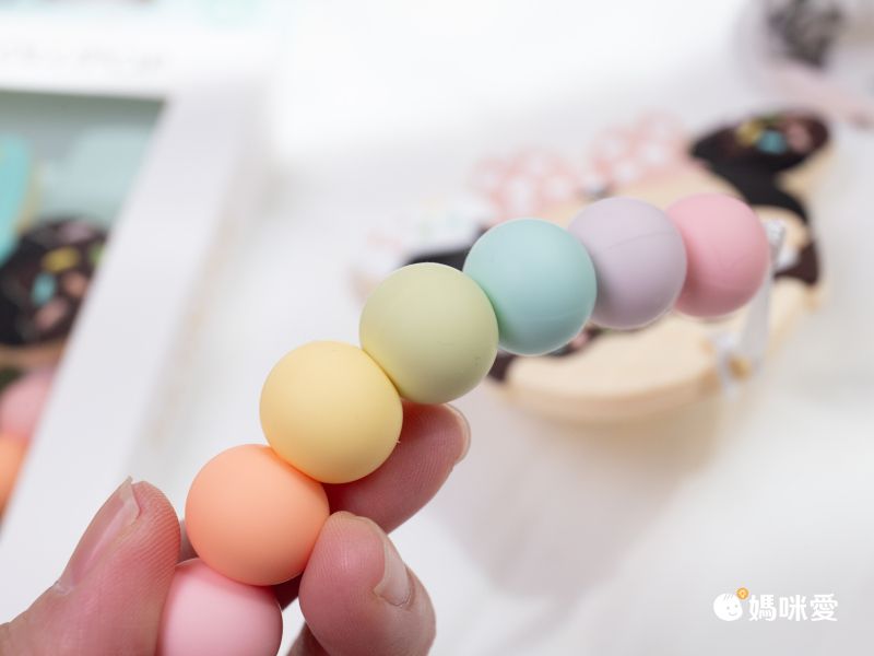 串珠的部分當然也是食用級矽膠!不同於一般平面固齒器的咬合感,珠珠鏈子的口感不同,一個固齒器有多重感受可以咬合很讚!特殊珠子串法,經過壓力、拉扯測試,可以有效避免珠子散開,也就不怕寶寶會不小心吞下肚了~