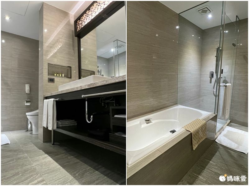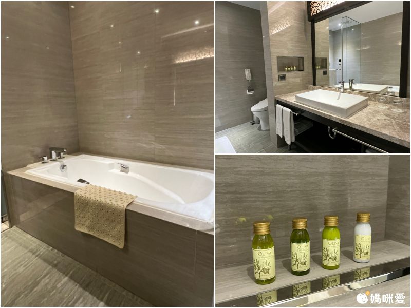 市景房配有乾濕分離的衛浴設備,也有浴缸、免治馬桶,備品是橄欖系列的相關商品,滋潤度與保濕程度都蠻有水準的。
