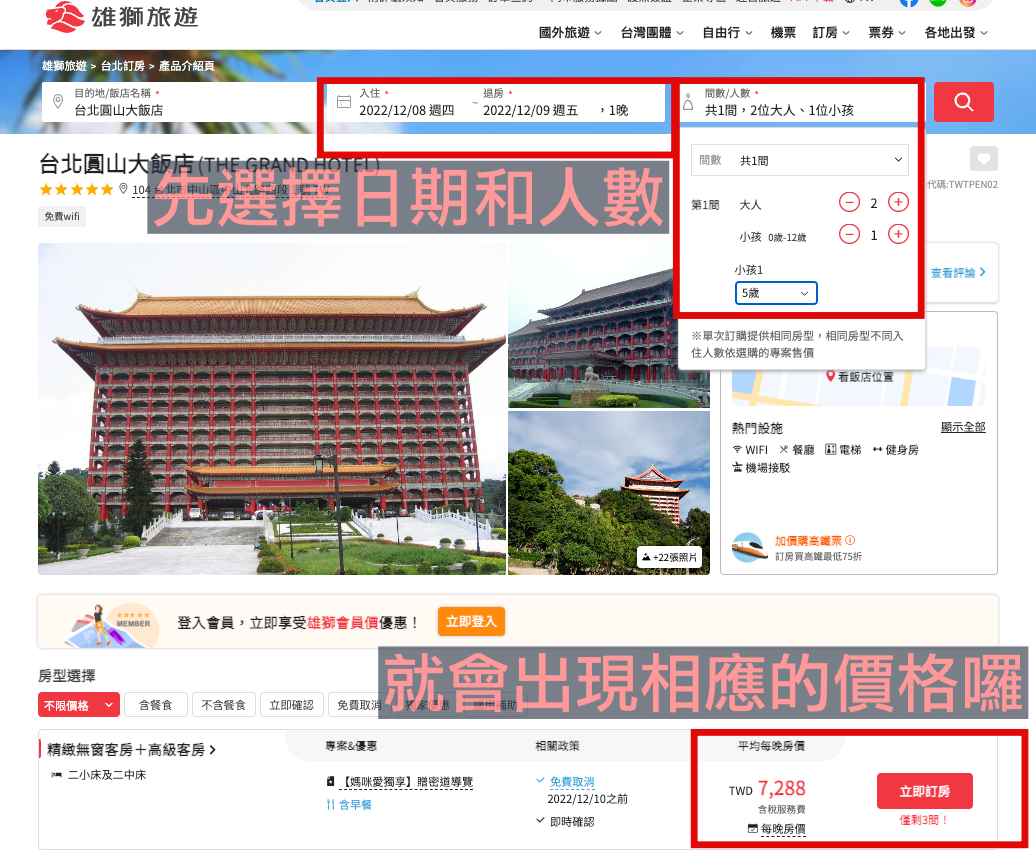 請爸比媽咪注意,打開訂房頁後,一定要選擇「入住日期」,「入住人數」選擇2大2小即可(不需選擇實際入住人數) ,就會出現一組二間房的專案囉。