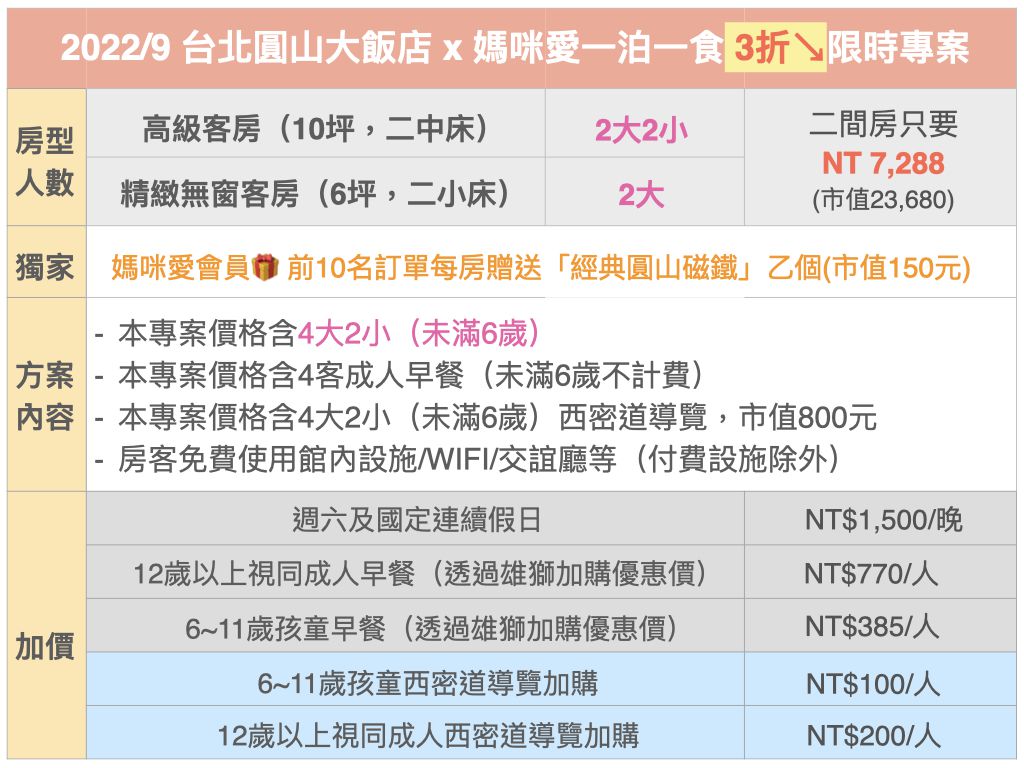 註一:每組可入住「4大2小,未滿6歲」(小孩滿6歲需加價早餐),為高級客房和精緻無窗客房,共二間房需同時住宿完畢。