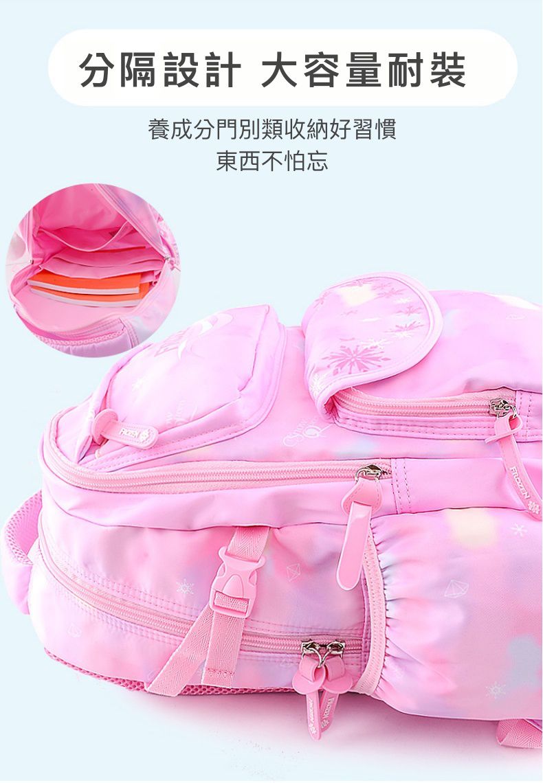 內裏很吸睛的是隔層的設計,不止多隔層,還有束帶:課本少的時候如果背著書包移動,裡面的內容物會晃動而不平衡不好背,將課本、物品固定在束帶內,背起來就很輕鬆惹!真的是很貼心的小設計呢