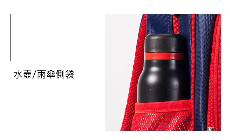 彈性鬆緊束口側袋,可以裝入水壺、雨傘,不怕掉落