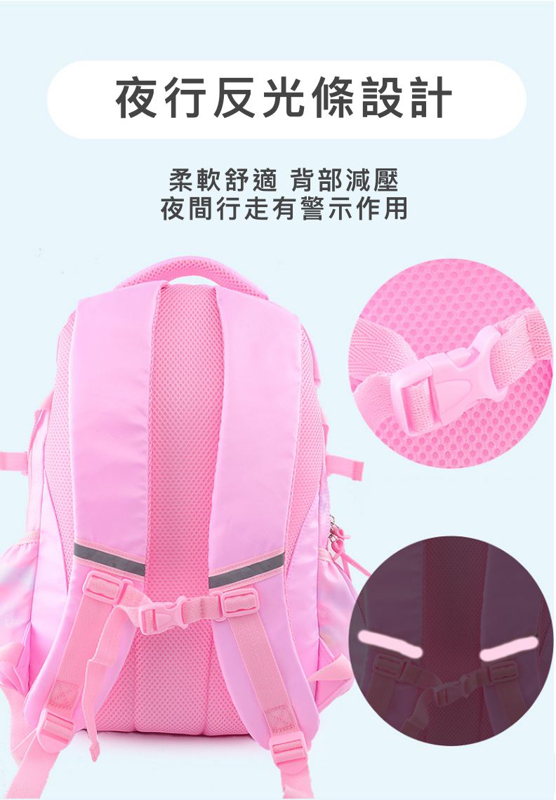 反光條設計,讓孩子背著行走在昏暗地點也能提醒往來車輛避讓,更安全