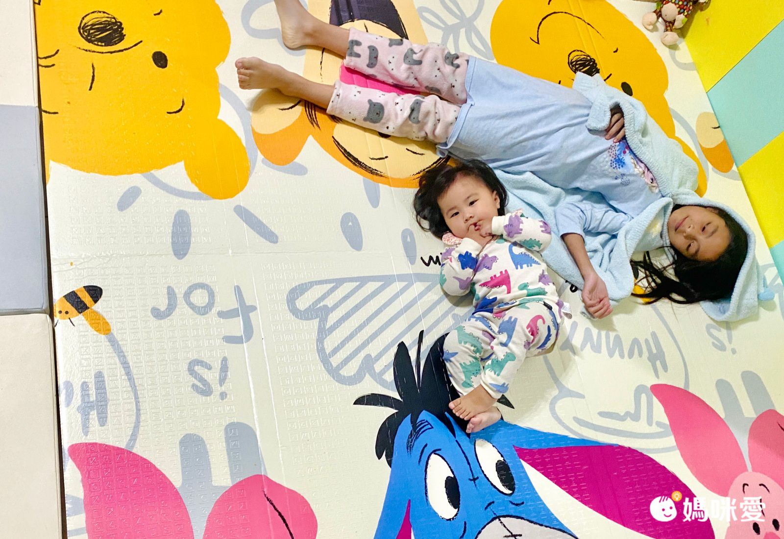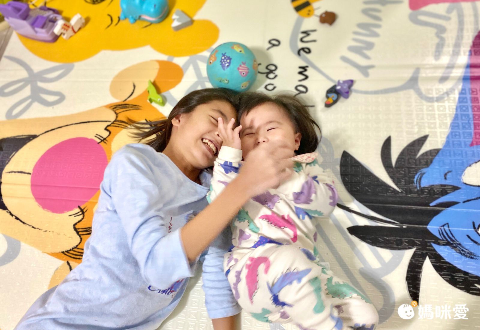 而且地墊真的很大,9歲的小姊姊Mina躺上去也沒問題~兩個人一起玩得超嗨!平常學爬行這活動度也是很夠啊~彈性跟緩衝力我也覺得很夠喔