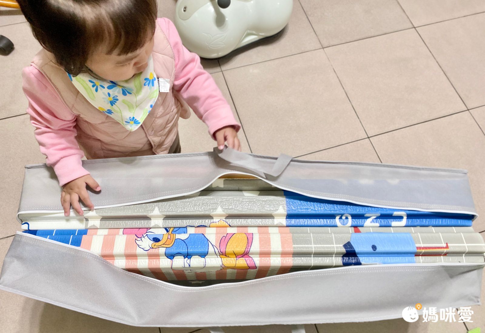 接著就來看看小佩媽的開箱吧~一收到地墊小Lina就興奮地站在一旁觀看!專屬收納袋也有超可愛的迪士尼字樣,質感也很厚實,品質超好的~之前提去娘家也零負擔,等春天天氣回穩,帶兩個寶貝外出野餐,這作為野餐墊也是很棒的選擇欸~