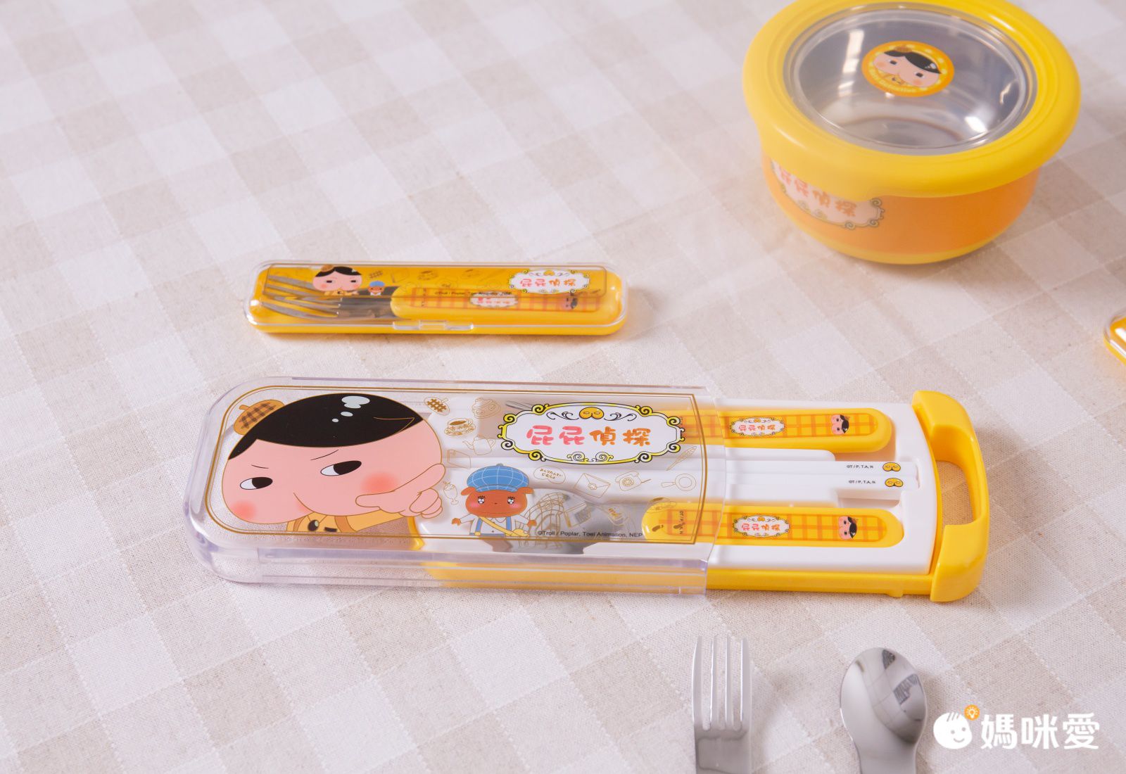單入的湯匙和叉子手柄都是這種塑膠材質的手柄,上面搭配著鮮艷的屁屁偵探花紋