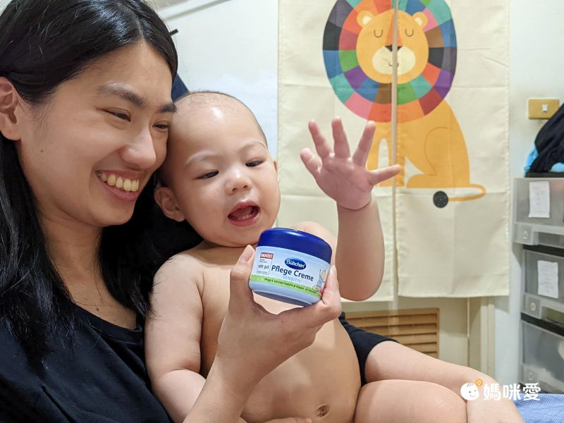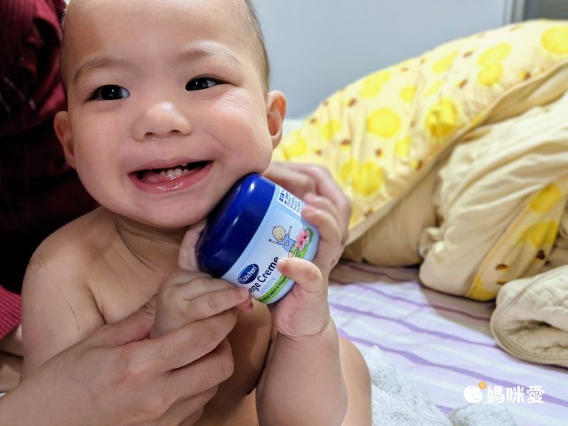 護膚膏也有乳油木果油、尿囊素、角鯊烷的成分,修復肌膚的同時,也能維持柔嫩舒適。質地跟雪花膏滿像的,雖是偏濃稠的質地,但很好推開,塗抹個幾圈就完全吸收了!很適合薯條正在到處爬爬走,隨時伺機而動的月齡XD