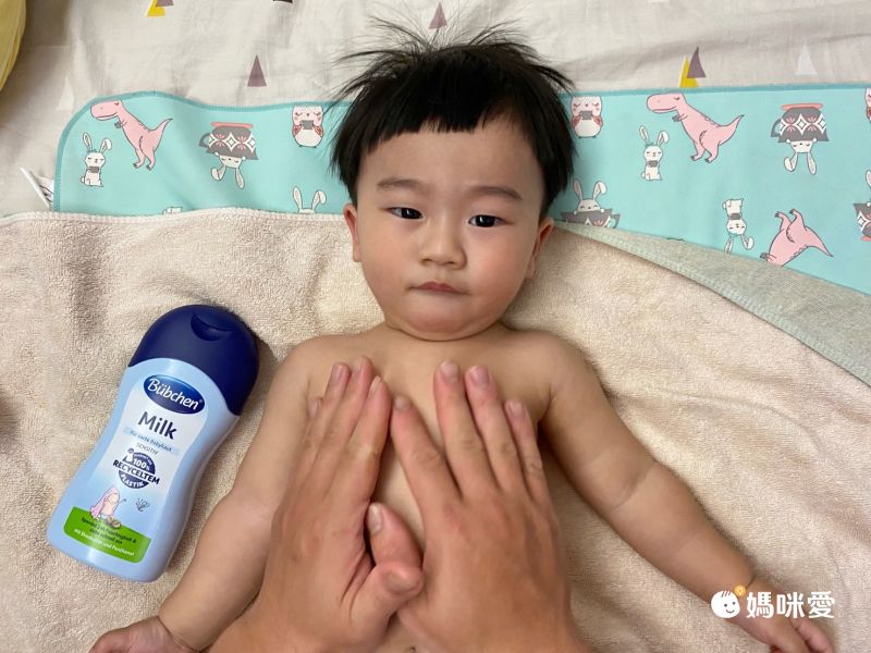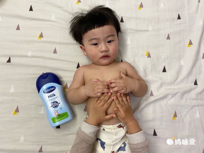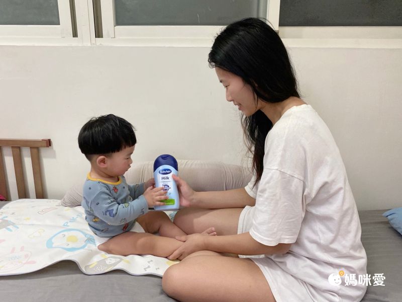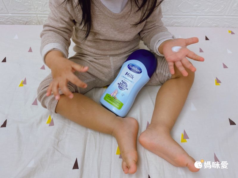 兩歲的姊姊王美也能自己擦乳液,水乳狀好推開快速吸收,讓她也很有成就感!擦完還會討著想要再擦一次!