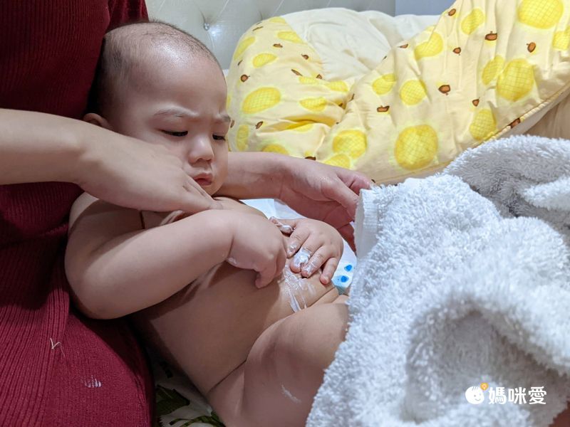 薯條用認真的表情把貝臣雪花膏抹了又抹,肚肚、雙腳、腳膝蓋窩、雙手都不能放過~(認真到眉頭都皺起來了呢XD)