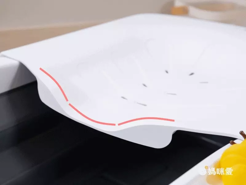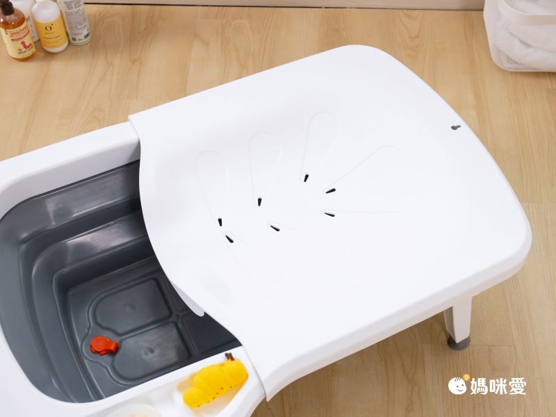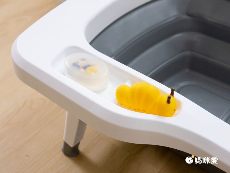 浴盆左側還有設計凹槽,能夠放置肥皂、沐浴球和洗澡玩具等等,幫孩子洗澡時不用再手忙腳亂去拿洗澡備品,好貼心的設計~