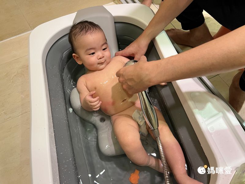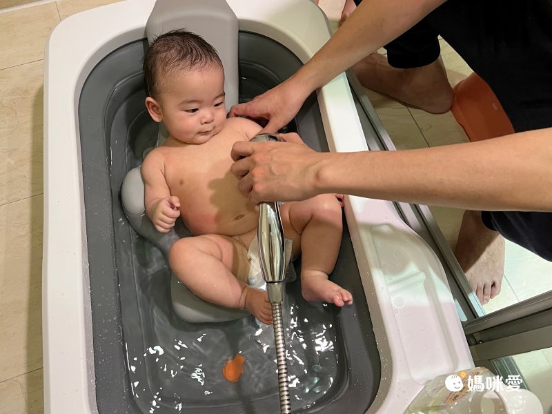 beego的爸爸超愛這個設計巧思,一邊幫寶寶洗澡,一邊還能把水注入澡盆,將蓮蓬頭固定住就不用一直開開關關水龍頭啦