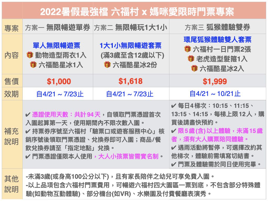 ✔ 票券兌換期間:自4月21日起至7月23日止(最晚需在7/23前兌換),自領取門票憑證首次入園起算第一天,94天內不限次數入園。 ✔ 此暢遊票是針對六福村陸上樂園(包含動物園),可享有94天內免費無限次入園,如遇水樂園開放期間(6月18日至9月11日),每人每次入水樂園須現場加價100元就能同時暢遊水樂雙樂園喔! ✔ 無限暢遊券需記名(1大1小皆須記名),會於首次入園時登記姓名及身分證字號,下次入園時需同時出示暢遊票券及相關證件(1大1小皆須出示證件喔 ✔ 使用無限暢遊券每次入園都需給付停車費喔!(停車場收費標準,機車50元,小客車120元) ✔ 六福村營業時間【平日】09:30~17:00、【假日】09:00~17:00 |