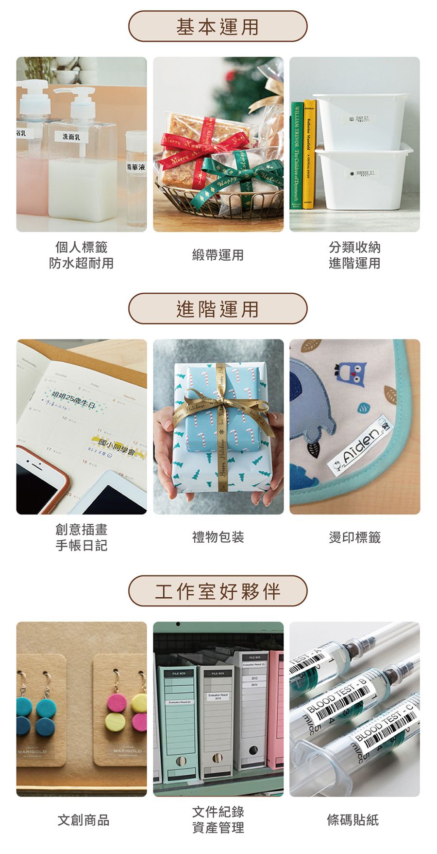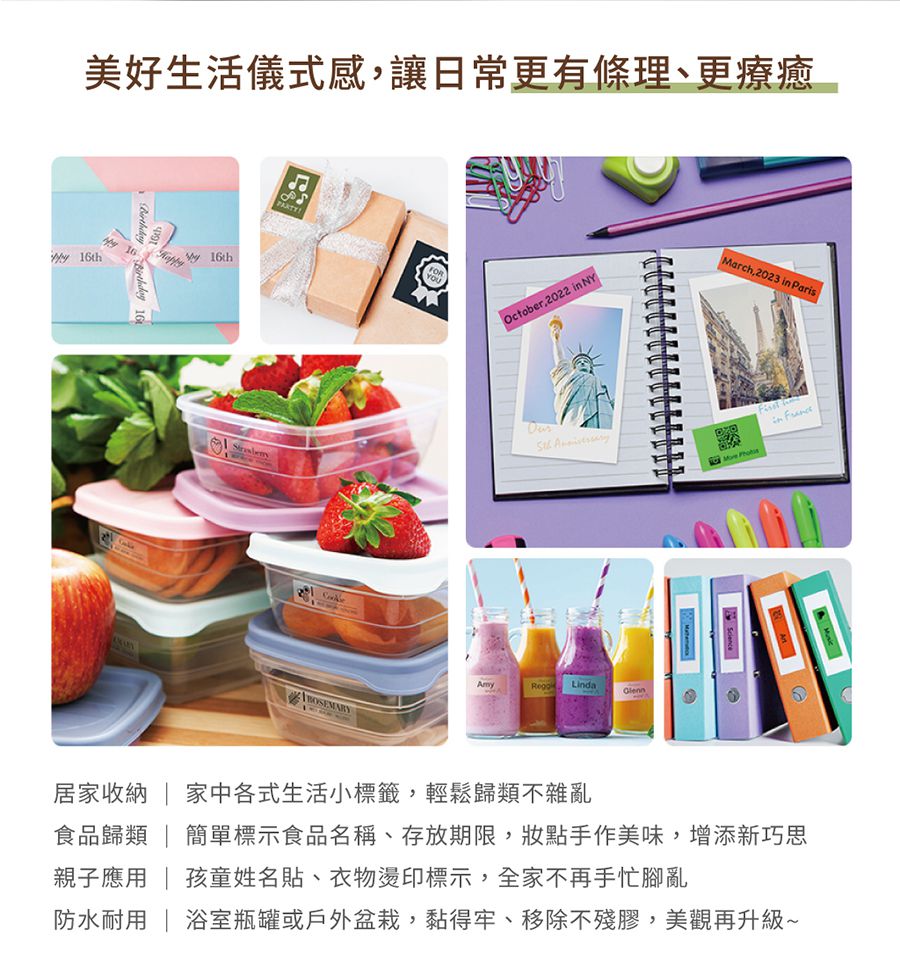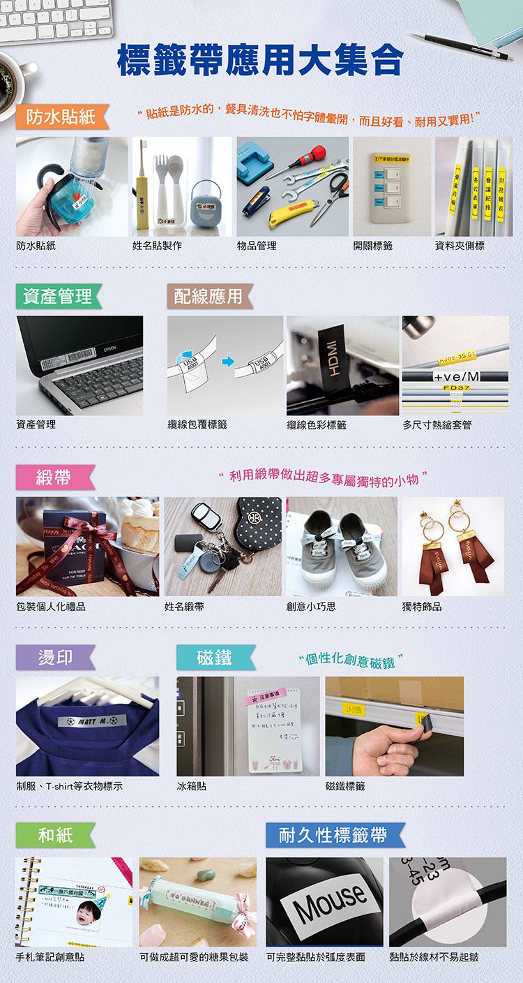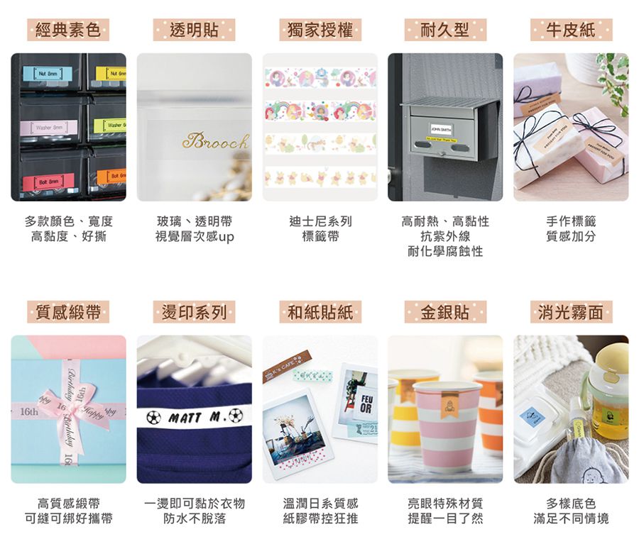 標籤帶有多種材質、尺寸、色彩可以選擇,上面印有底色跟文字顏色,用緞帶包裝禮物、和紙紀錄日記本、大大小小分類標籤貼、當然還可以製作姓名貼,令現下最夯的創意手作變得簡單,讓分類控愛不釋手❤️ 不擅長分類也可以玩得不亦樂乎(誤