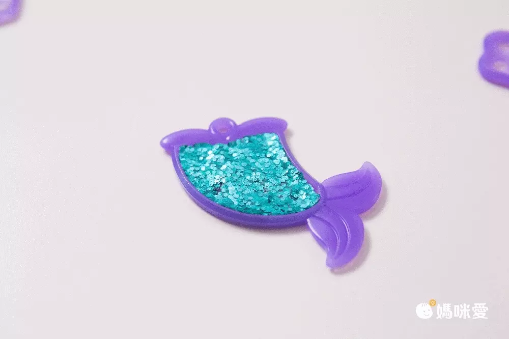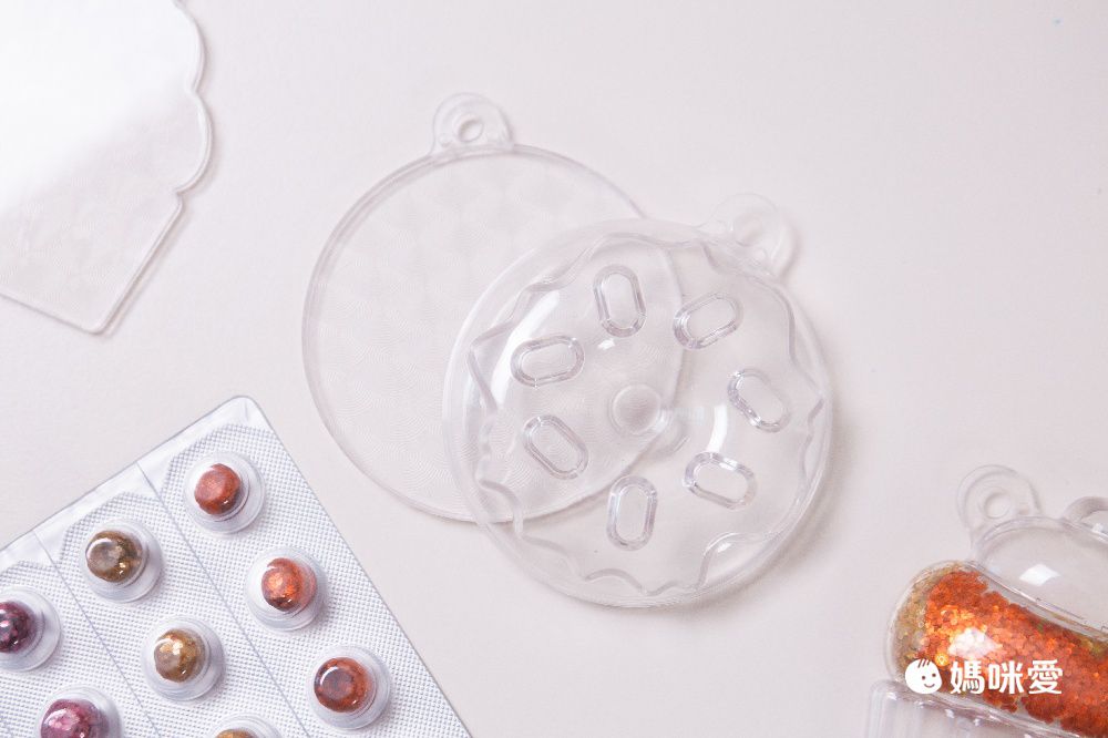 每一個吊飾有前、後 2 個透明壓克力模板,在凹槽面把閃亮魔豆壓入就可以開始填色!