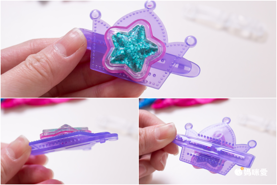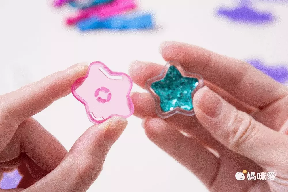 接著再找到對應形狀的粉色背殼,把他們對準、扣上!超閃亮的星星就完成,馬上把它裝在不同的髮飾上吧!
