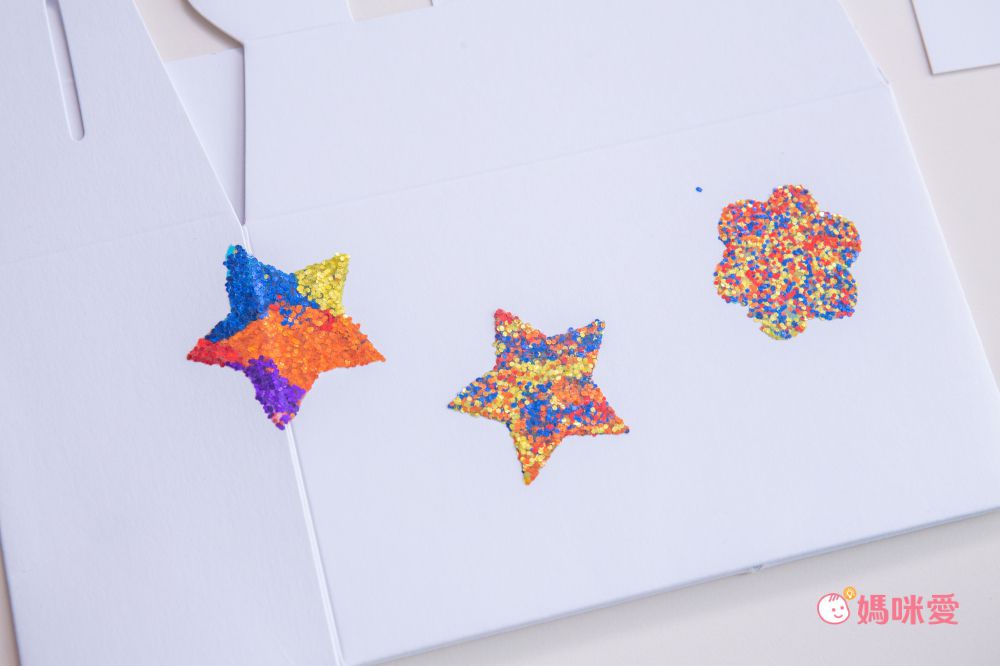 登愣~這樣就完成愛心、星星圖案啦 ❤ 壓在白色紙卡上就是獨一無二裝飾,再加上幾筆畫筆裝飾就超可愛了!