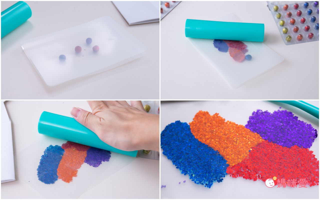 作法也很簡單唷,首先將盒子裡面的兩張塑膠片拿出來,將魔豆貼放入其中,再用滾輪來回輾平就完成第一步啦!這個步驟小朋友超愛,滾來滾去很有新鮮感呢!