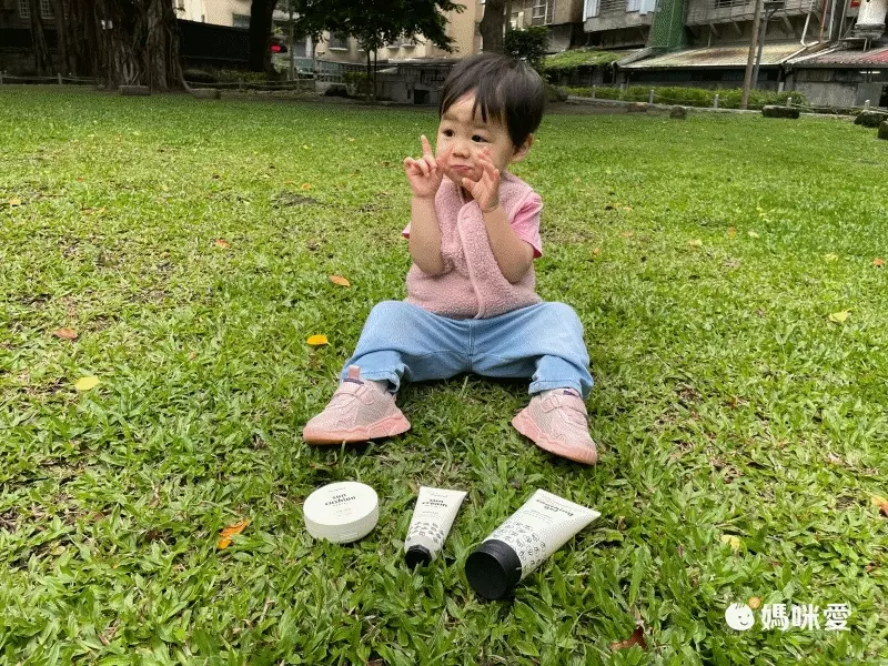 因為臉已經鋪滿粉底了,柳橙媽咪就請柳橙自己擦一下手臂的部分。保濕防曬乳使用7種草本植物萃取,並添加神經醯氨補足肌膚水分,防曬係數SPF30, PA+++,有效阻擋UVA, UVB,很適合戶外踏青、戲水時使用,跟大人塗防曬乳一樣,記得定時補充才能好好保護皮膚!