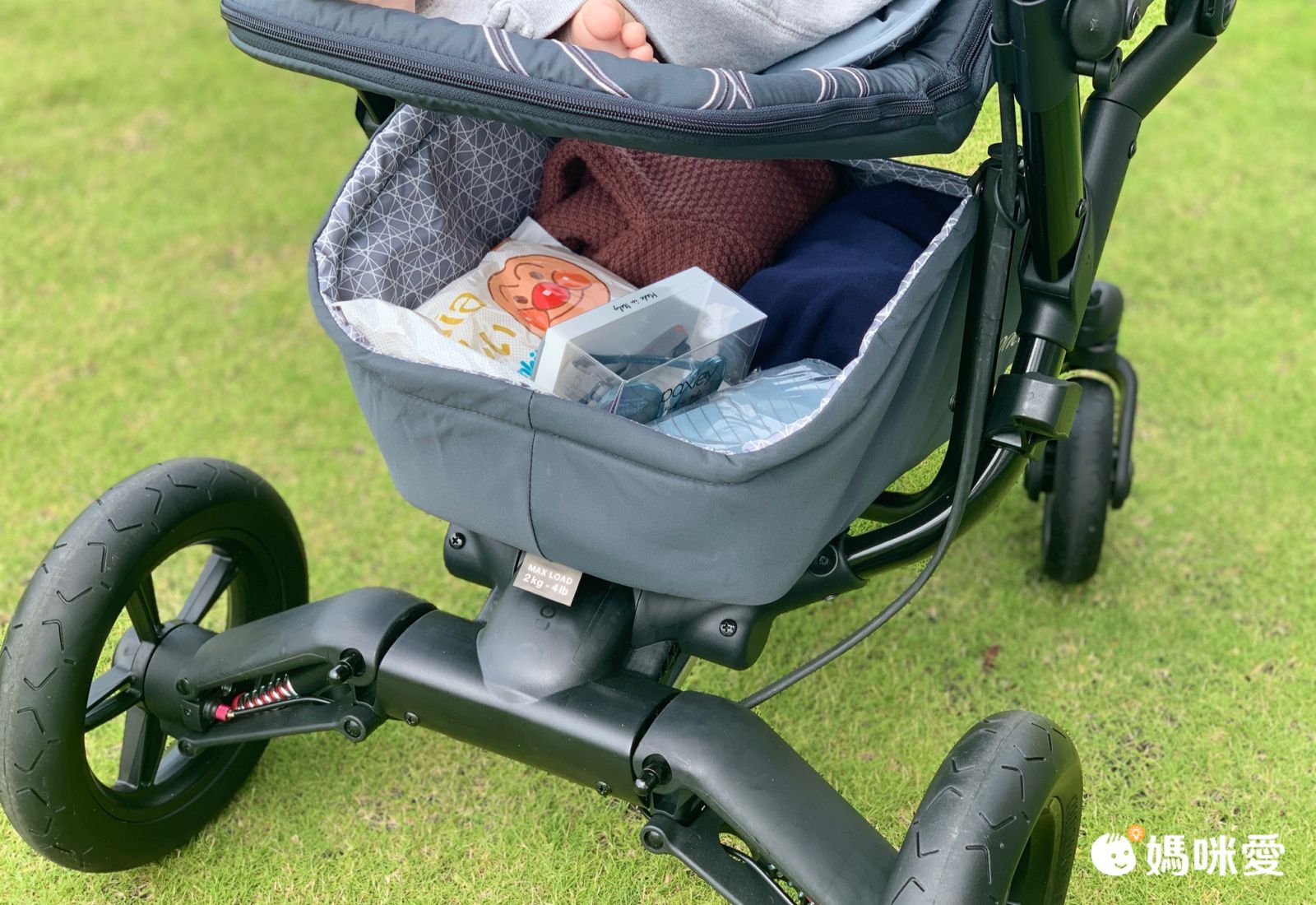 下面的置物籃也很大~放上宸宸會需要用的濕紙巾、小外套等還綽綽有餘
