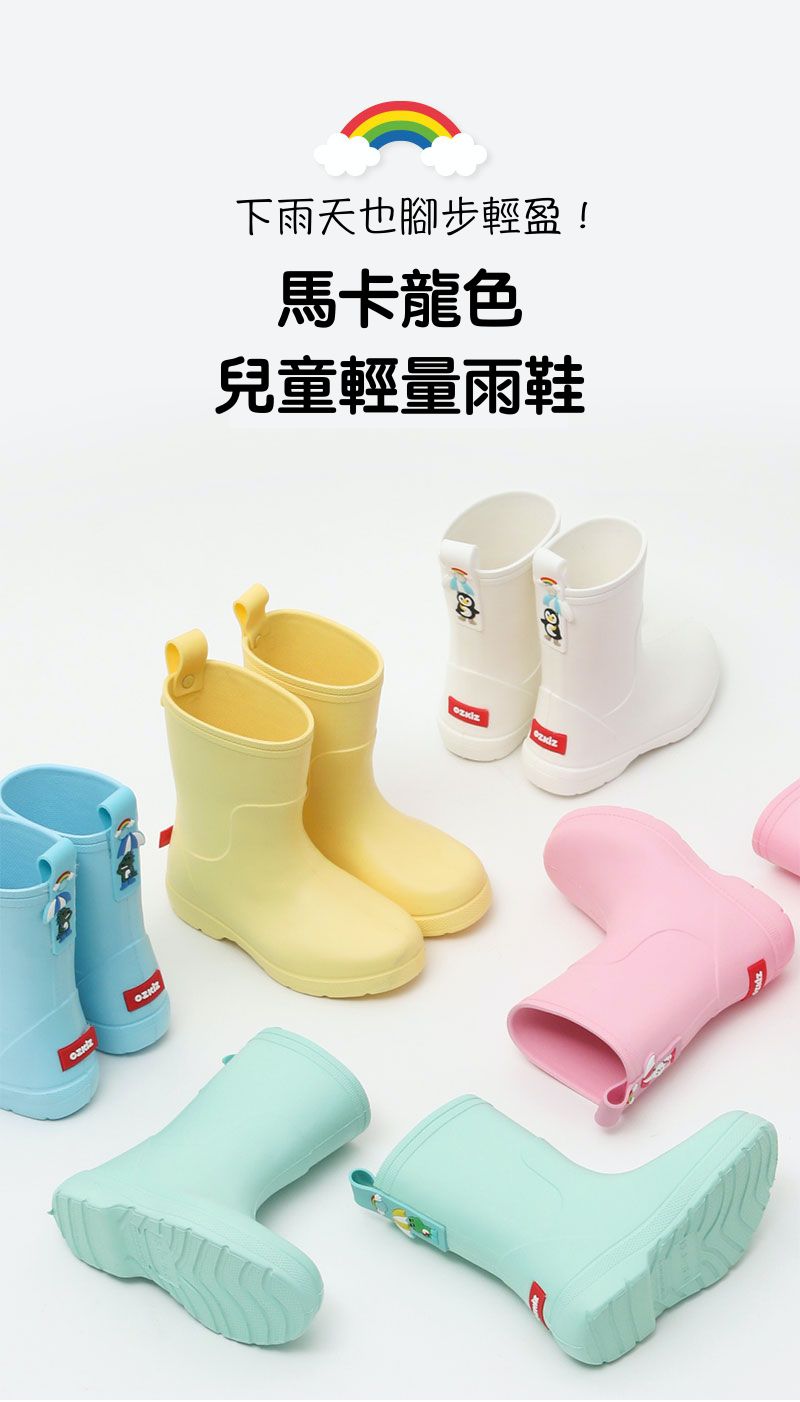 他們家這系列的雨鞋超級可愛!粉嫩的馬卡龍色系,即便雨天穿也十分亮眼~ 而且超輕量,寶貝穿上後一樣能自由跑跳 d(`・∀・)b(但天雨路滑,還是要留意腳下!)