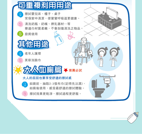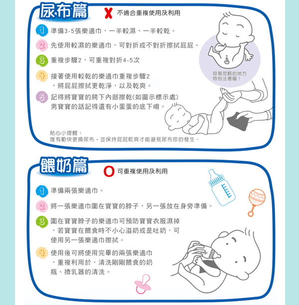 附上乾濕兩用巾的用途說明,提供給媽咪參考唷:)